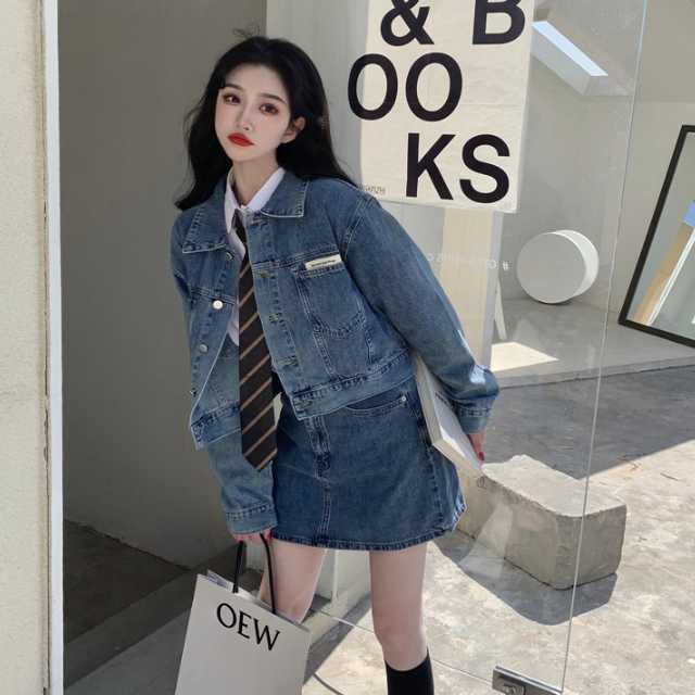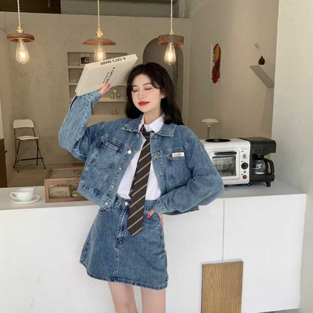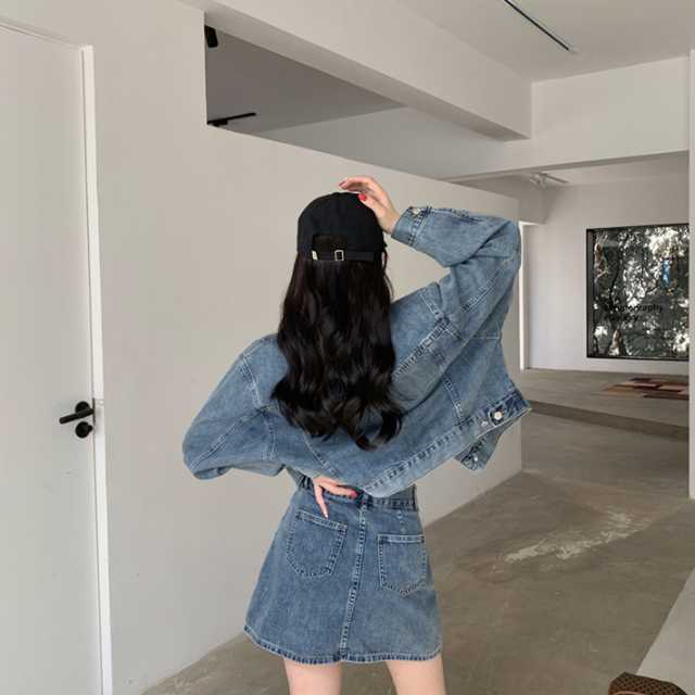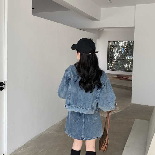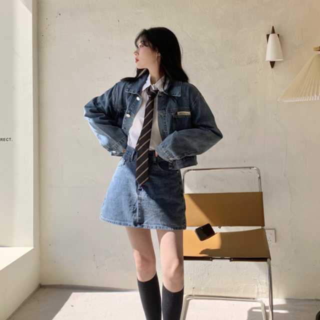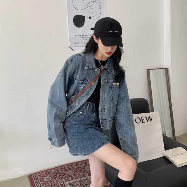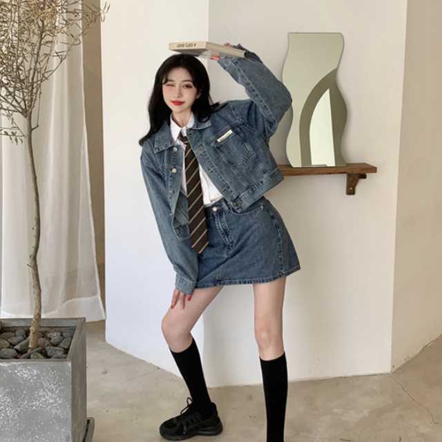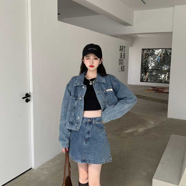 ショート丈でヤングカジュアルな印象を与えるデニムジャケット&スカートのセットアップ♪