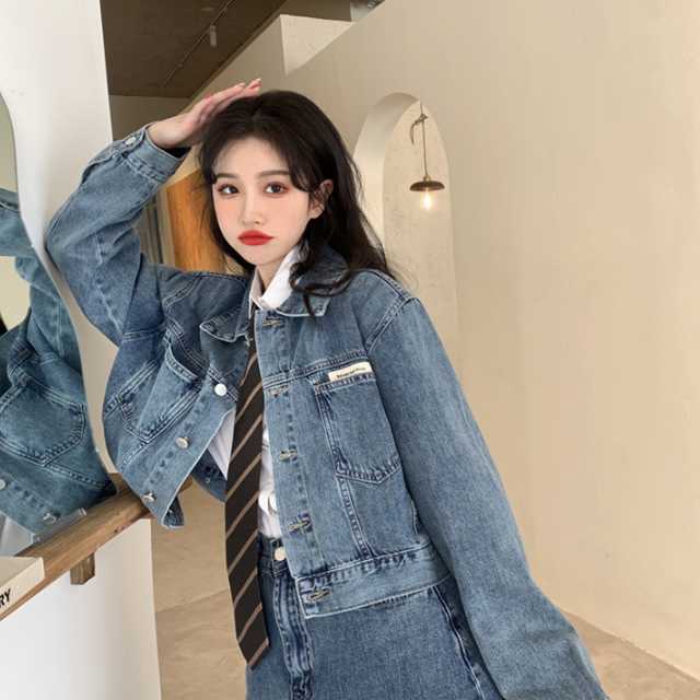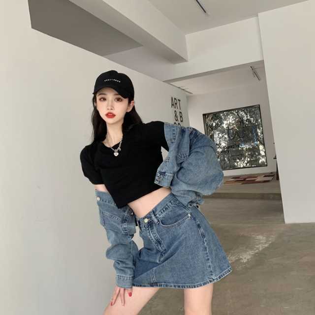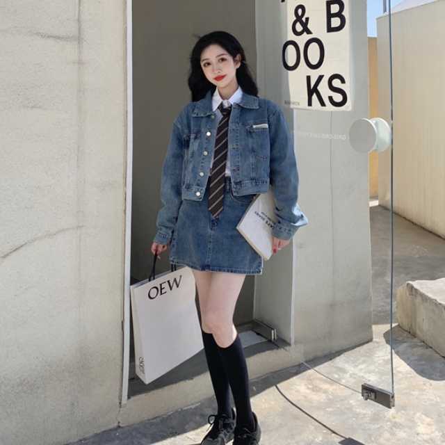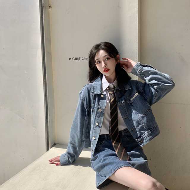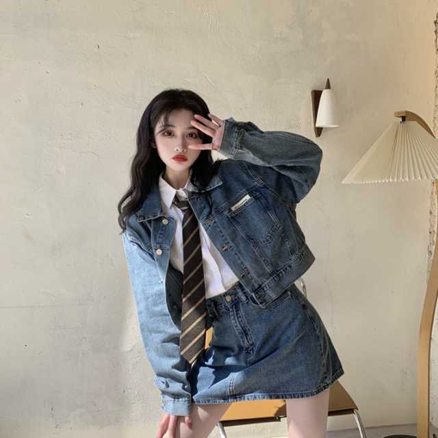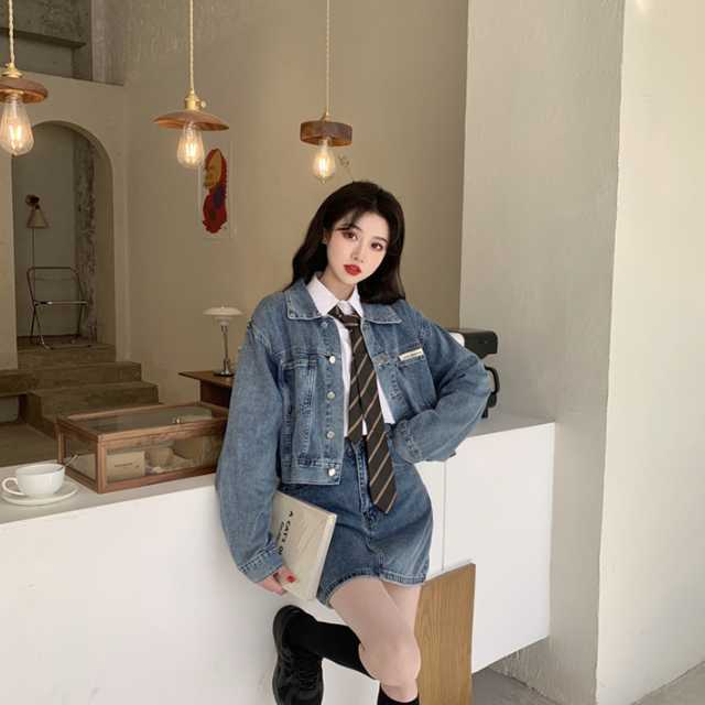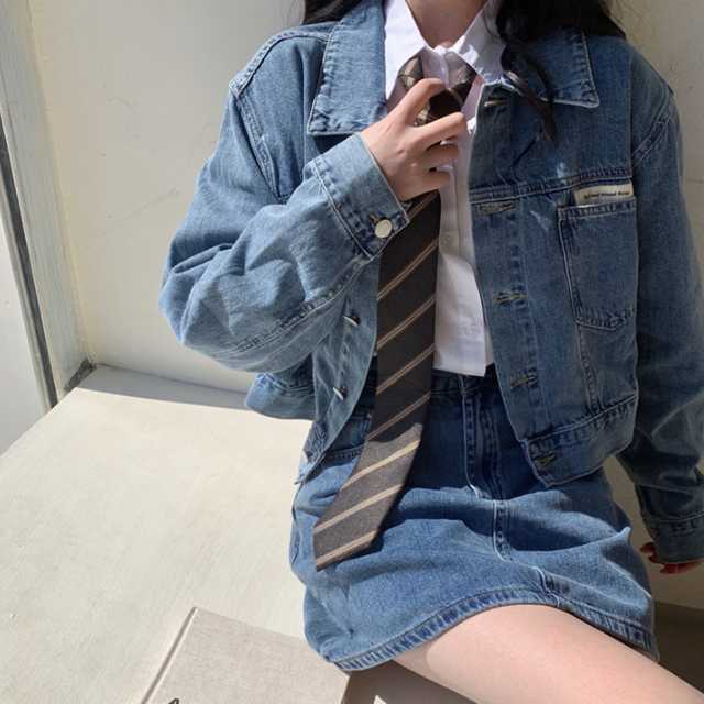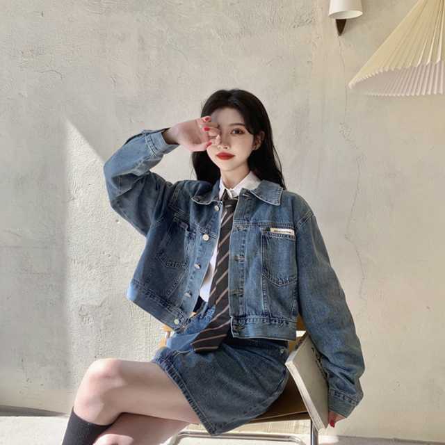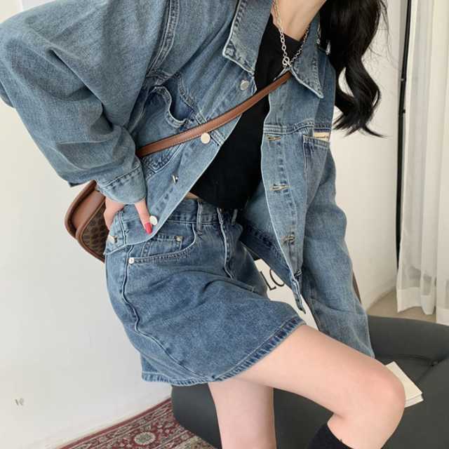 ショート丈でヤングカジュアルな印象を与えるデニムジャケット&スカートのセットアップ♪