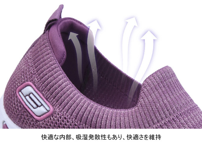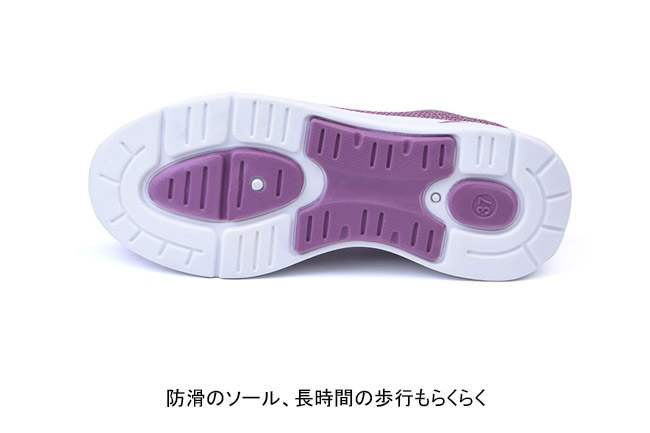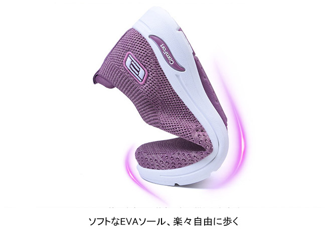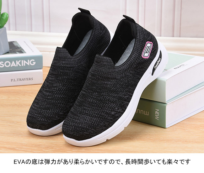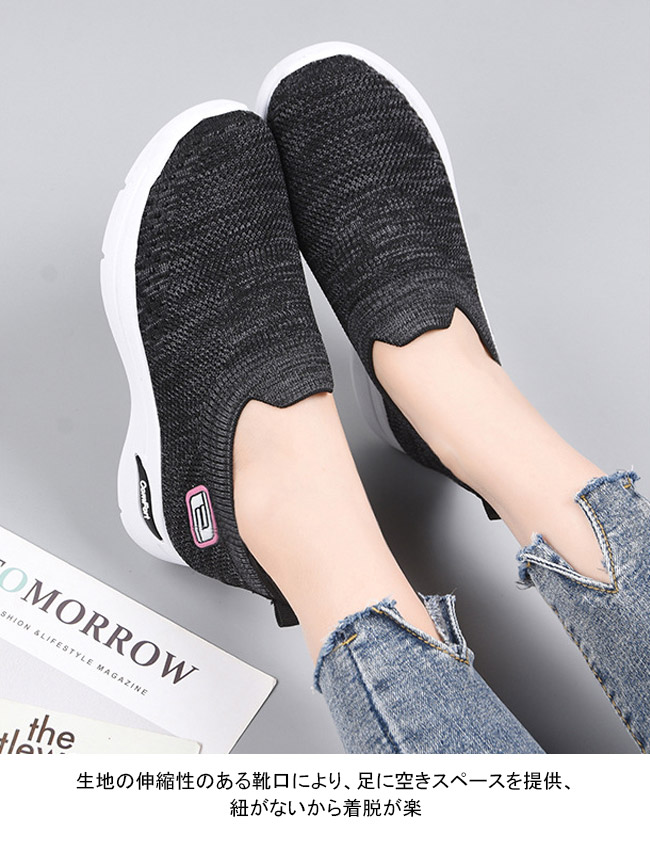 生地の伸縮性のある靴口により、足に空きスペースを提供、紐がないから着脱が楽。