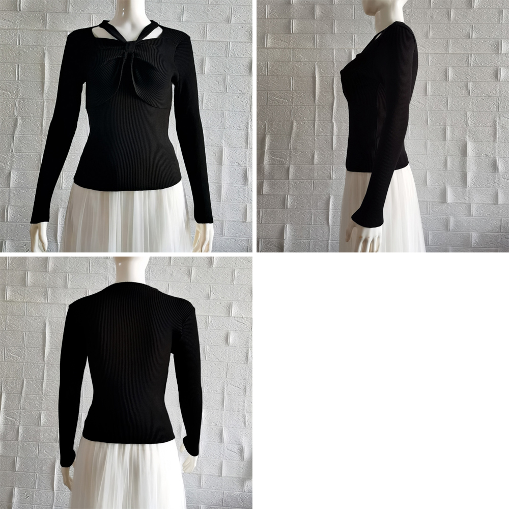 フロントの大きいリボンデザインとホルターネックがお洒落なニットトップス