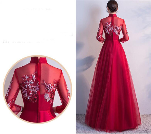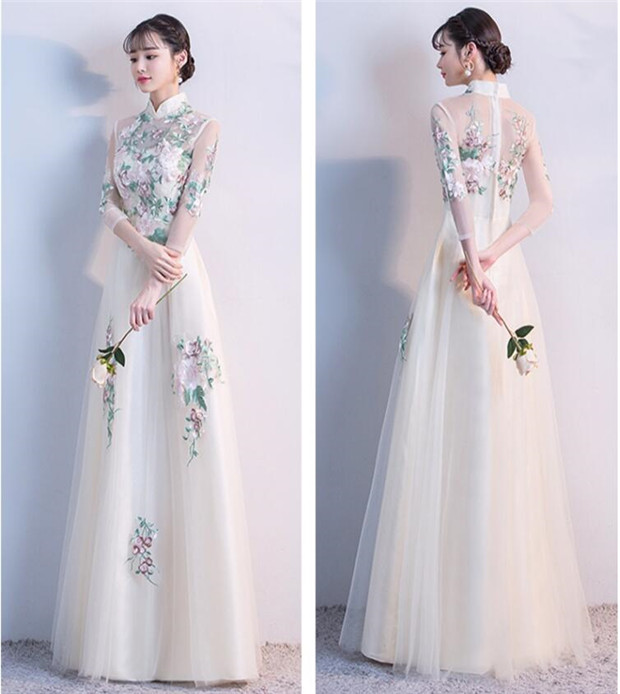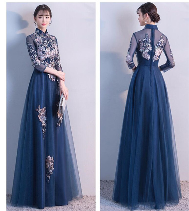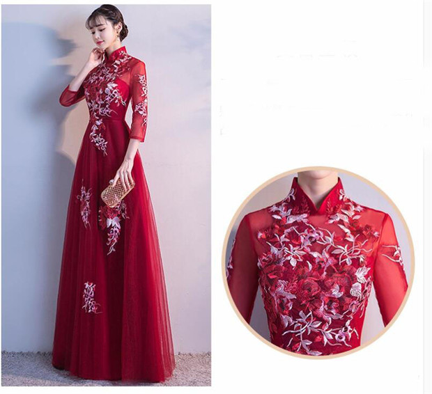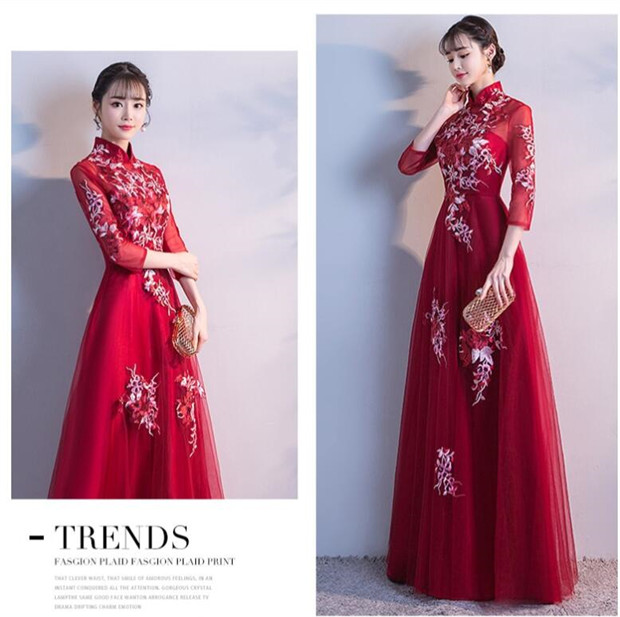 ドレス 大人 ピアノ 発表会 結婚式 母親 チャイナドレス ドレス 刺繍 パーティードレス パーティドレス 袖付き ロングドレス 二次会 Aライン お呼ばれ ワンピース 7分袖 ワインレッド ネイビー シャンパン色