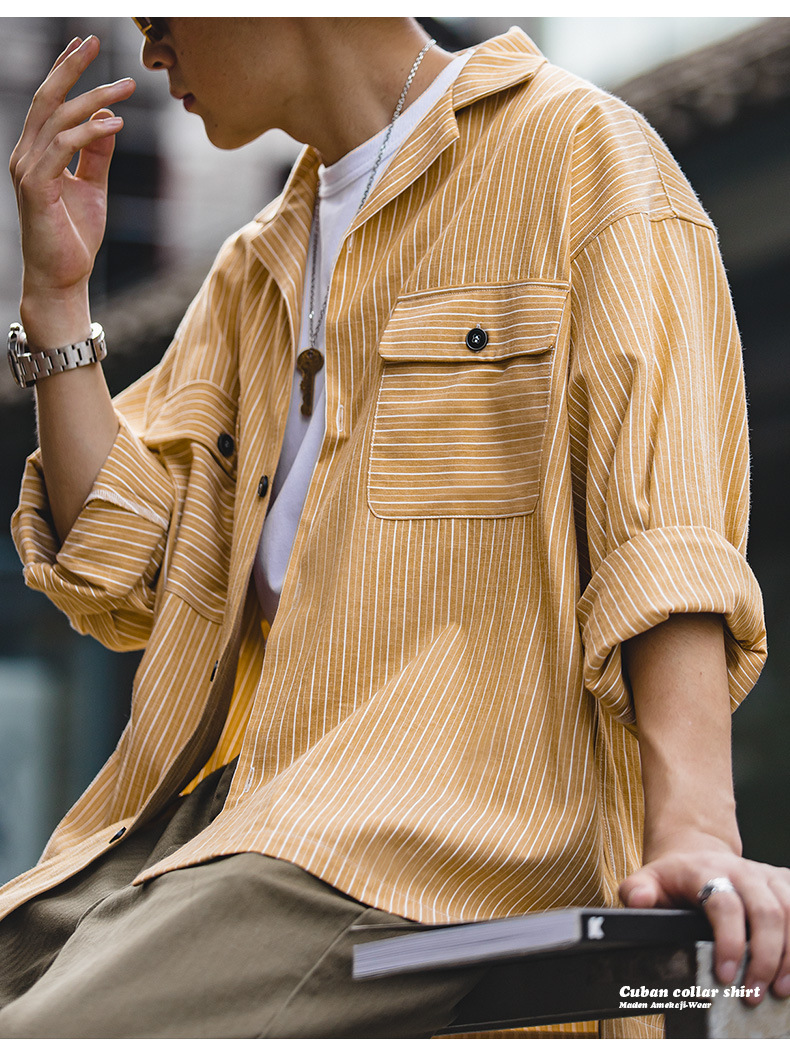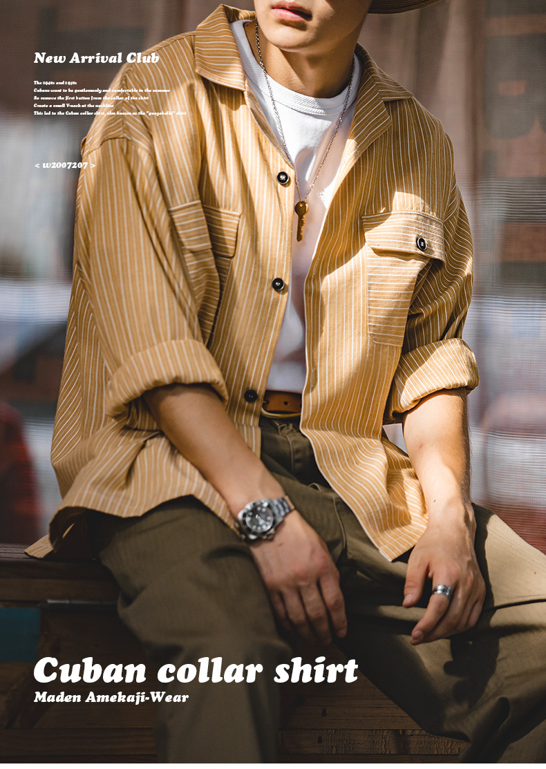 開襟シャツ メンズ ストライプシャツ ゆったり アメカジ 休日スタイル 長袖シャツ シャツジャケット 羽織り 男性 トップス ダブルポケット