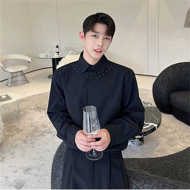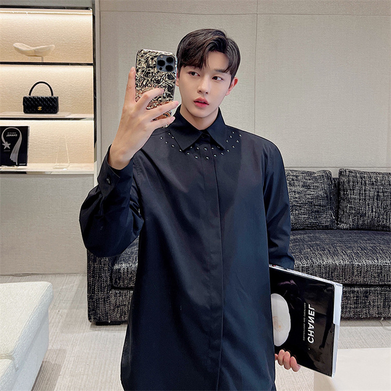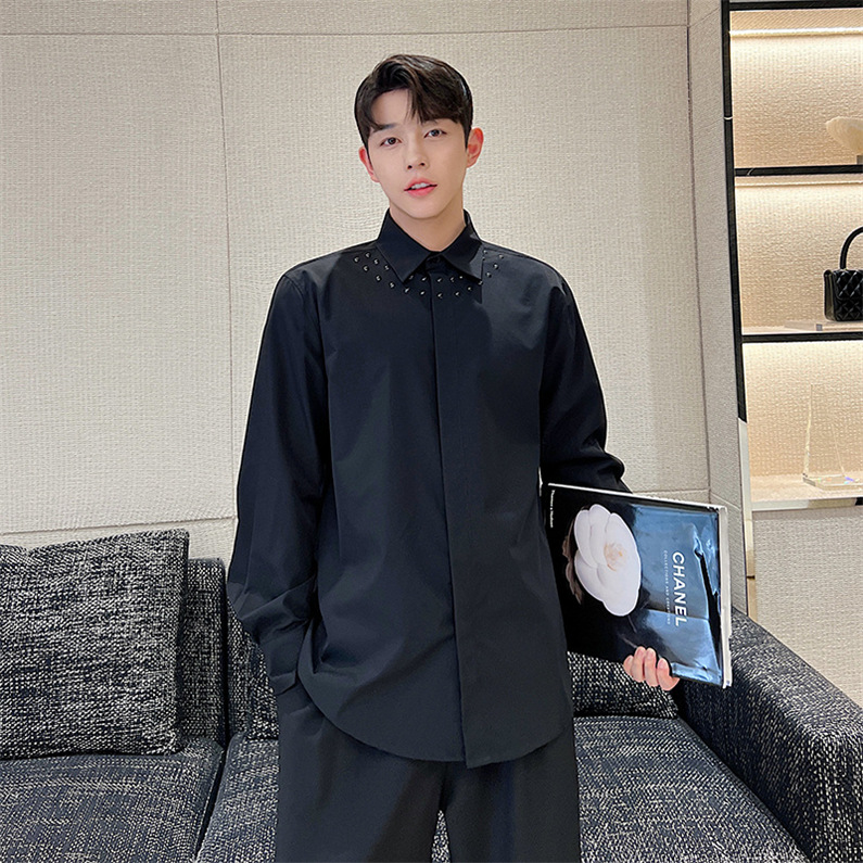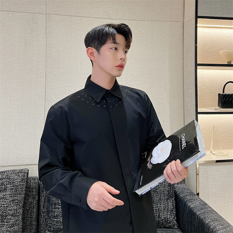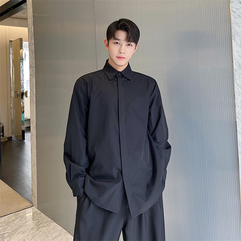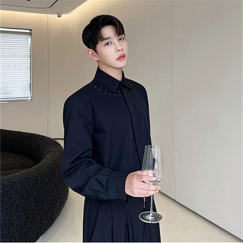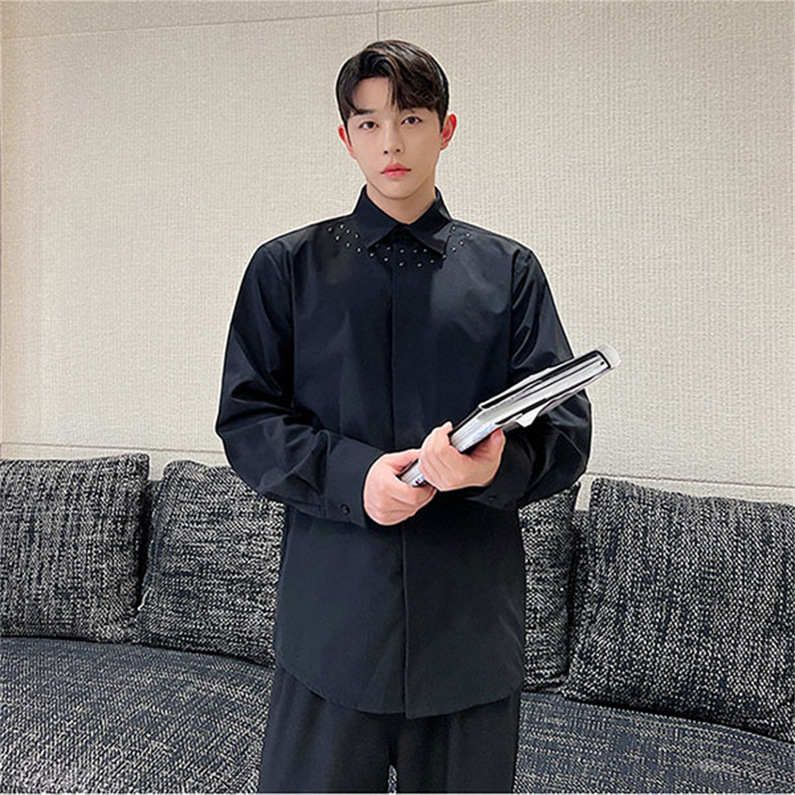 メンズ シャツ カジュアルシャツ 長袖 黒 ワーク 上着 発表会 クラブ 無地 上質 ブラック スタイリッシュ 春秋 ダンスウェア 公演 男子トップス