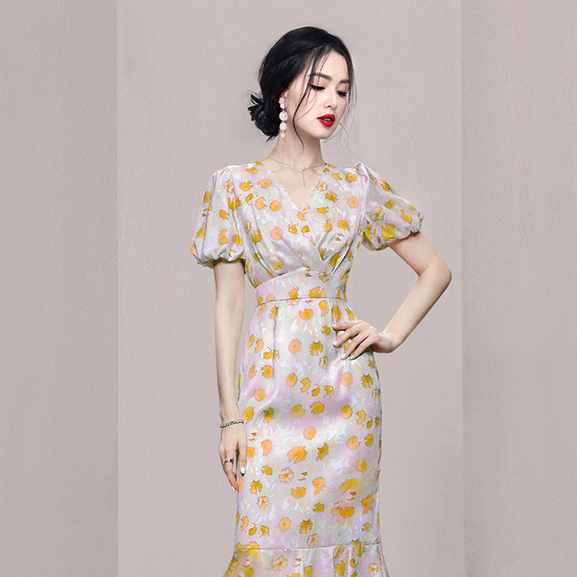 ドレスキャバ。花柄。上品でエレガントなマーメイドラインのドレスです。デザインポイントはキュートなパフスリーブ使いです。