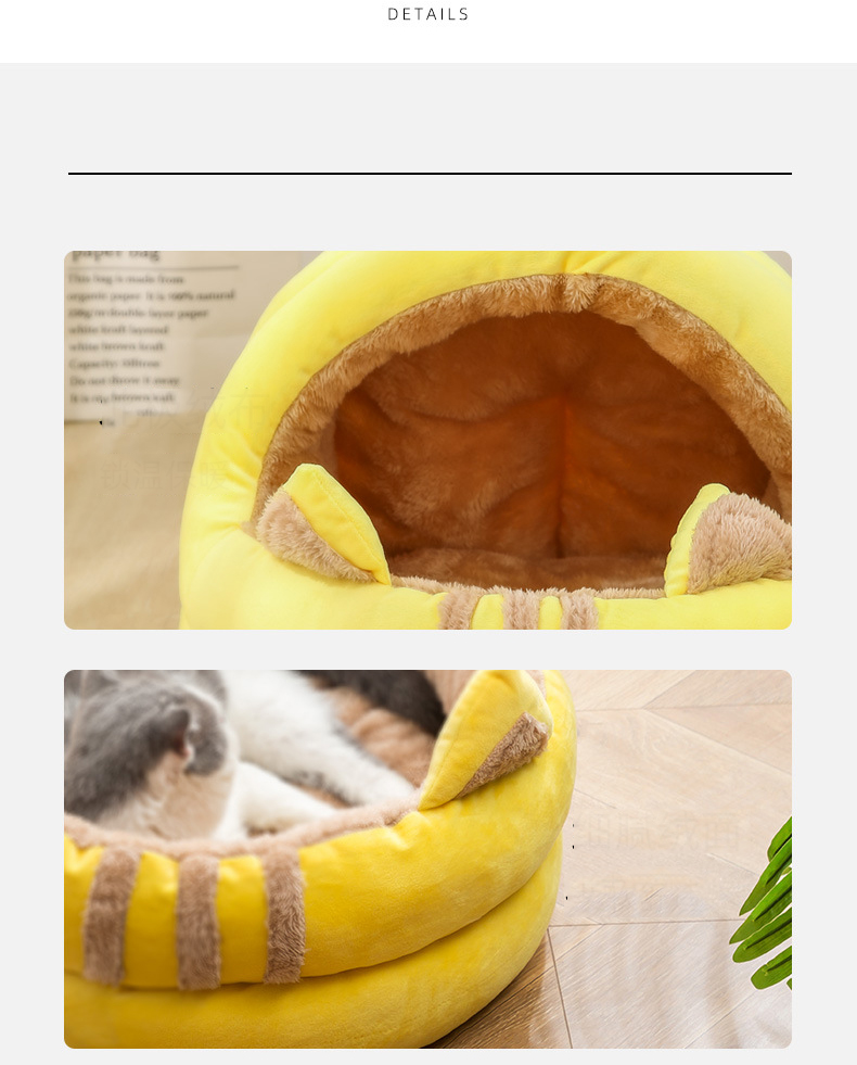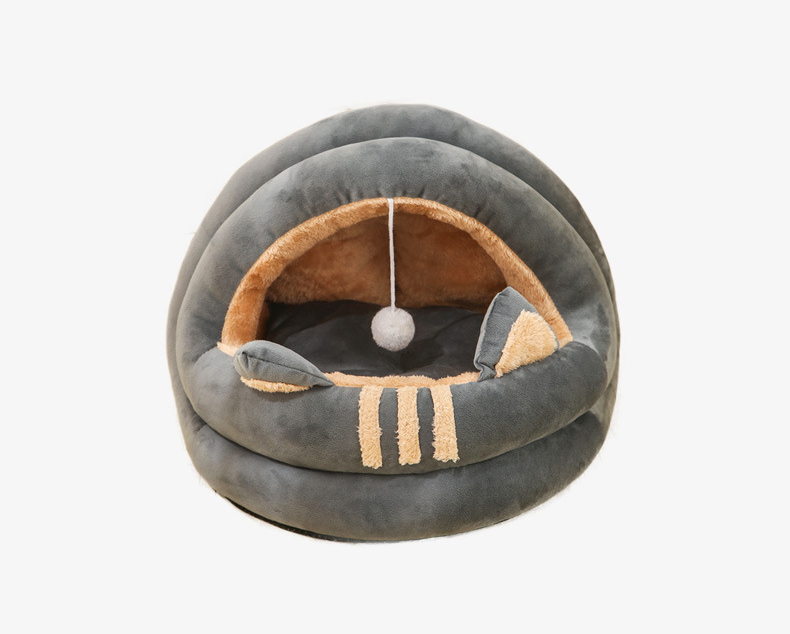半分屋根のついたドーム型のペットベッドは、寝袋のように包まれる形が特徴。
