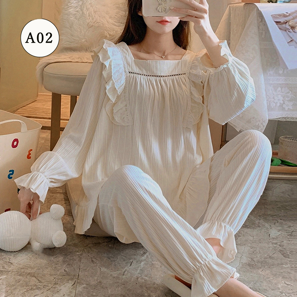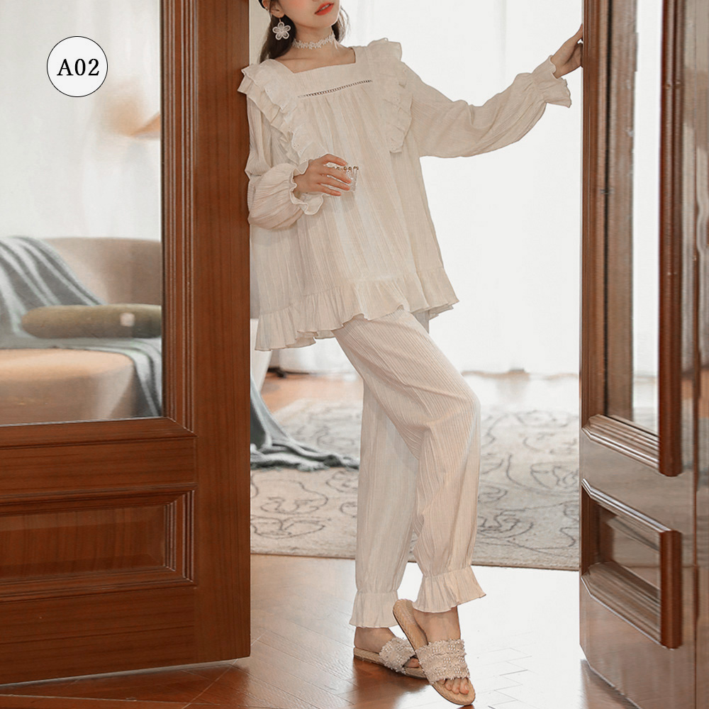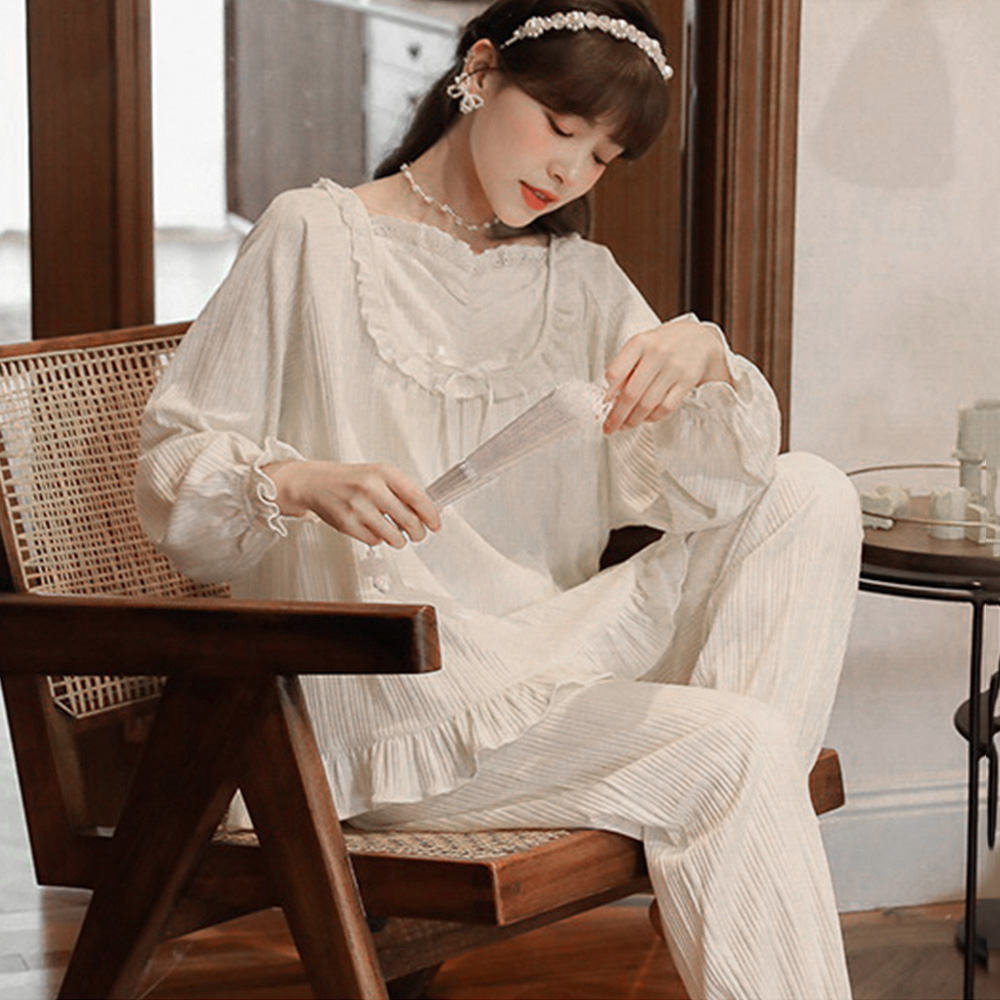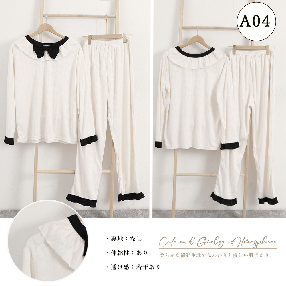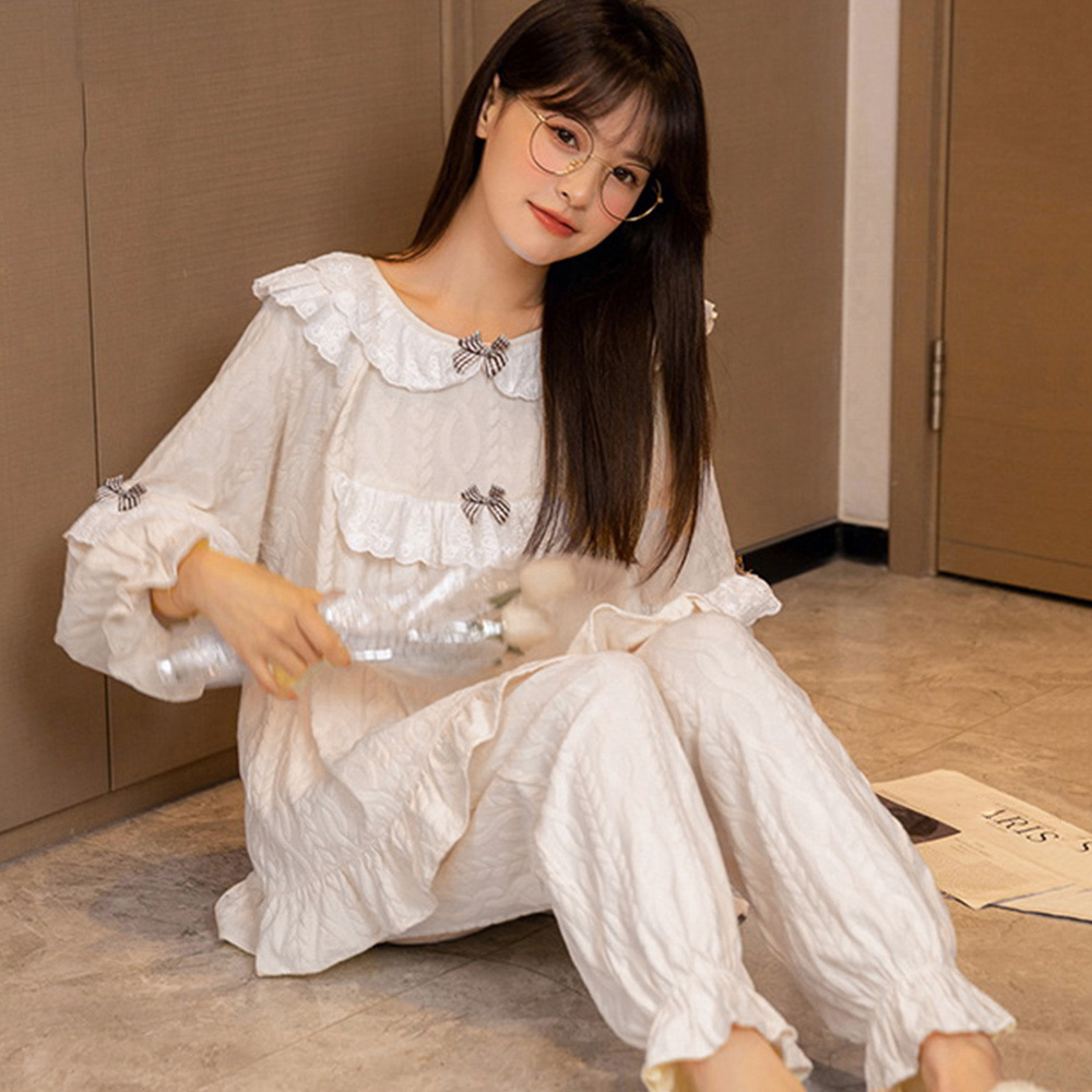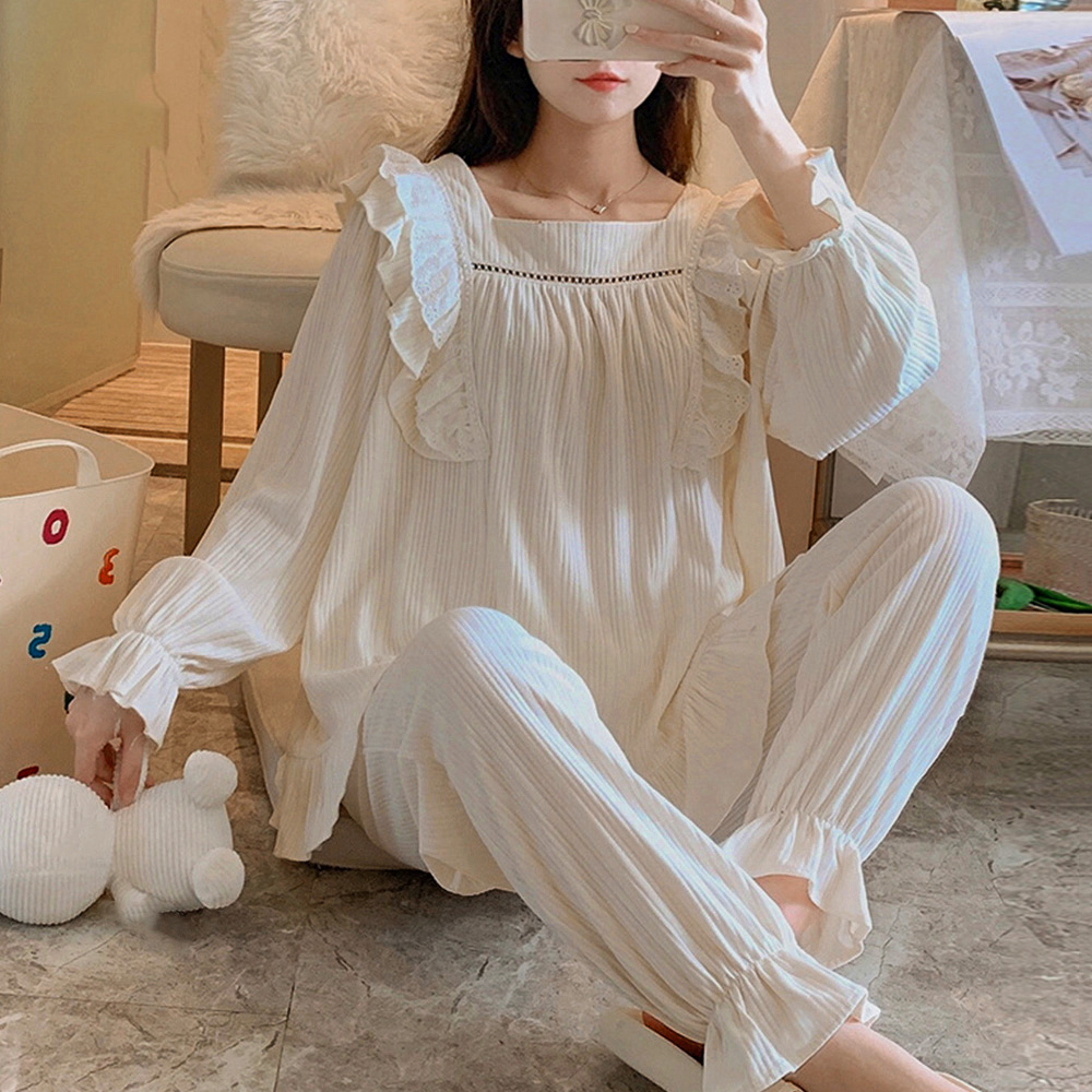 長袖 レディース 部屋着セットアップ 韓国ファッション 白お姫系寝巻き フリル裾長袖 長ズボン 大人 ナイトウェア春秋冬