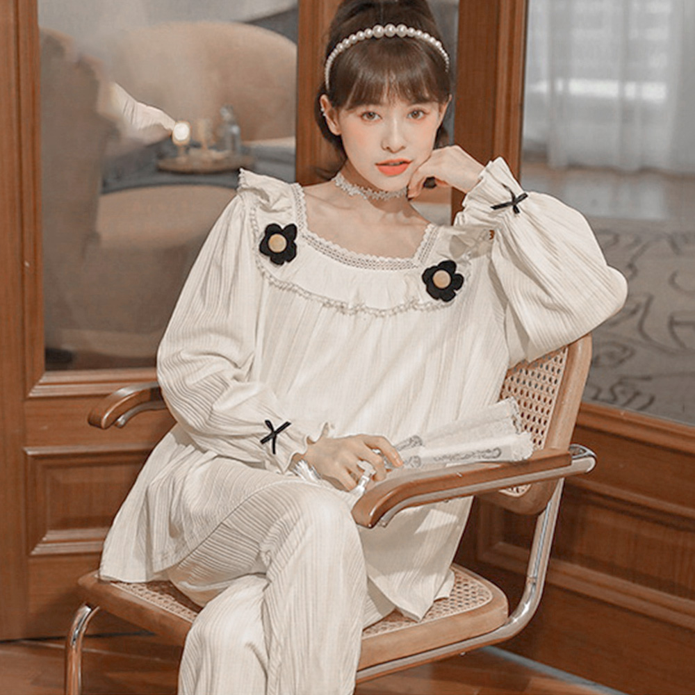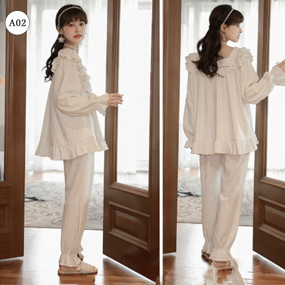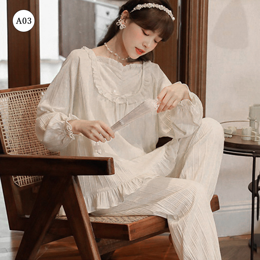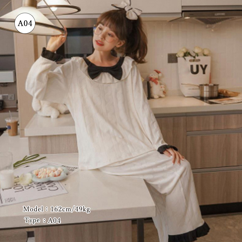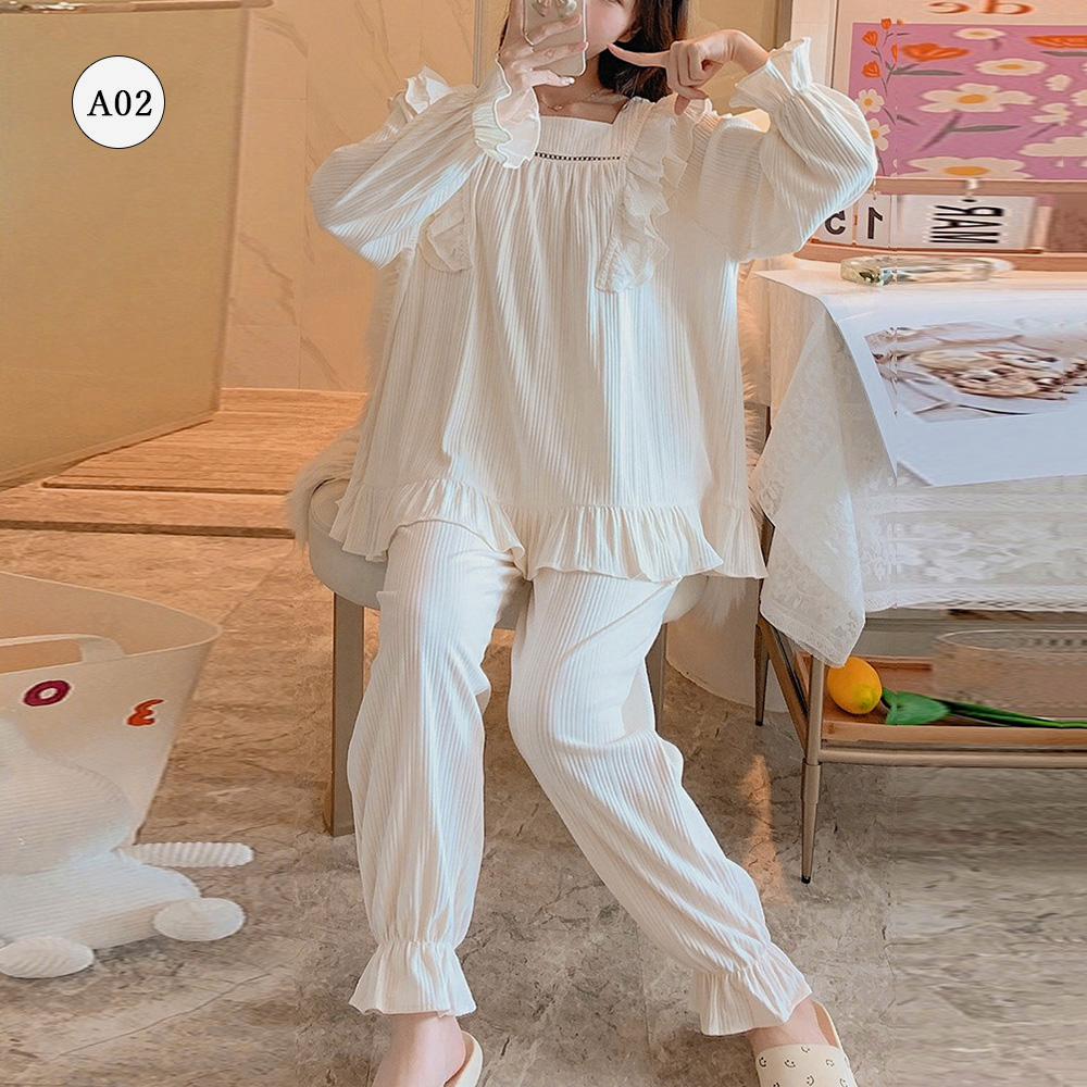 長袖 レディース 部屋着セットアップ 韓国ファッション 白お姫系寝巻き フリル裾長袖 長ズボン 大人 ナイトウェア春秋冬