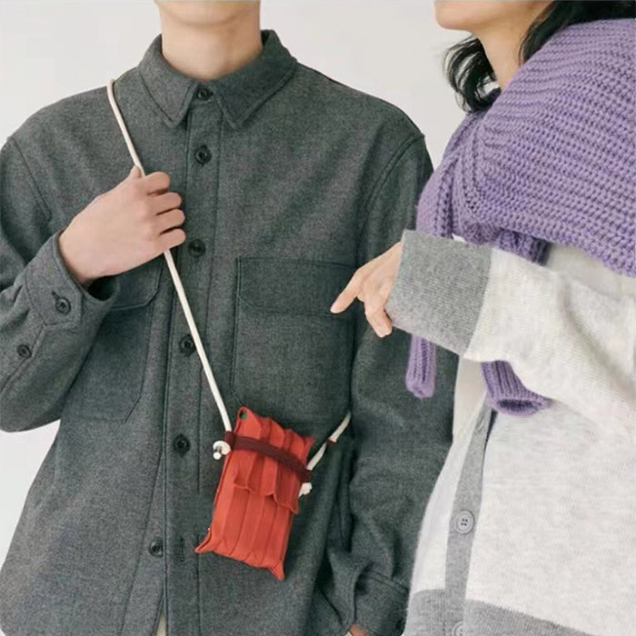 ショルダー紐は、結び目の位置を自由に変えて長さ調節可能