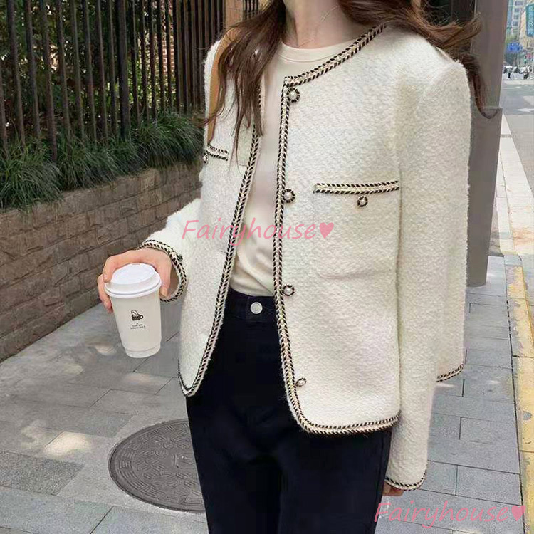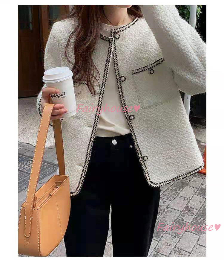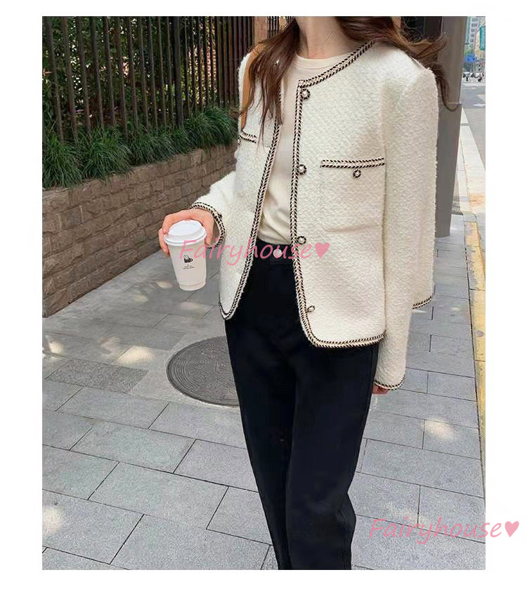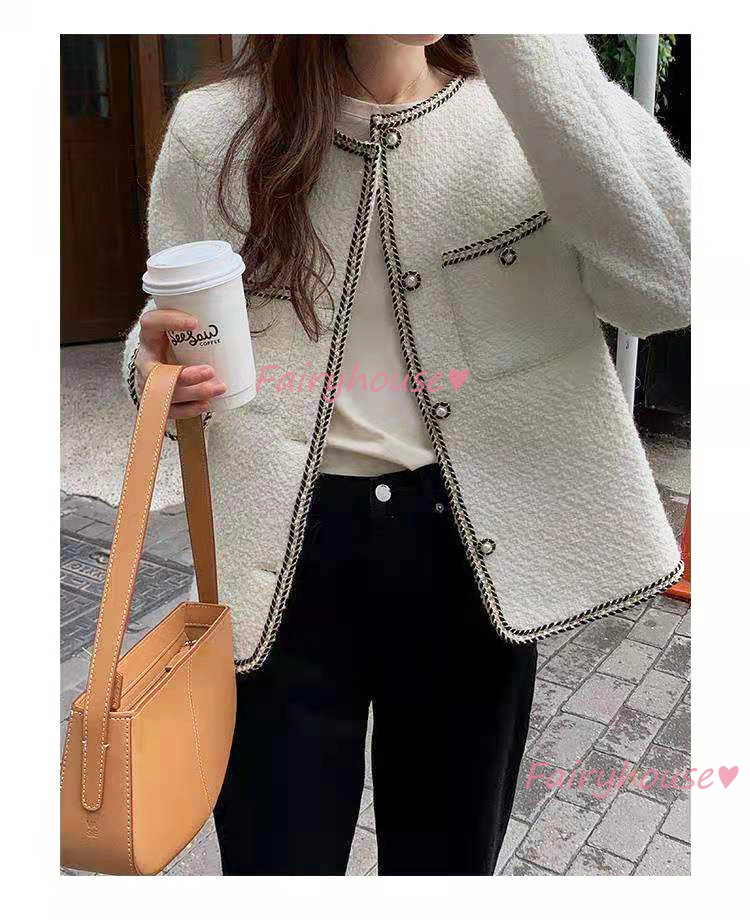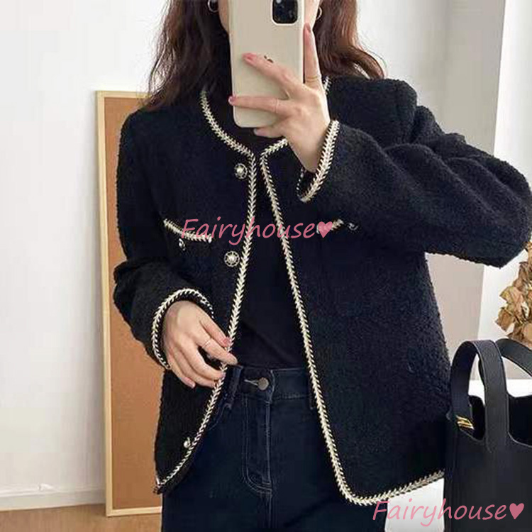 連携キーワード :ツイードジャケット レディース 40代 長袖ノーカラージャケット 黒ショット丈ツイードコート 春コートアウター 秋服 大人韓国風 通勤OL オフィス 結婚式 入学式 卒業式 30代 50代