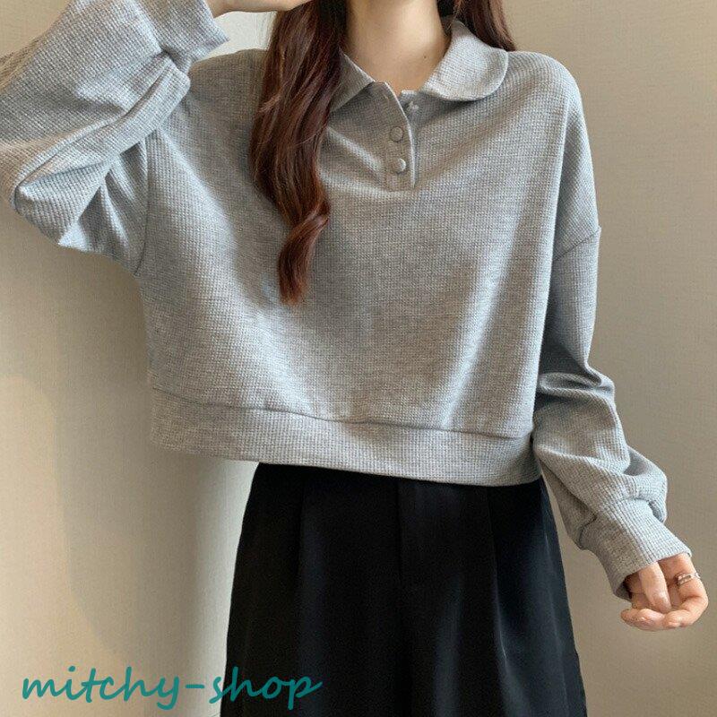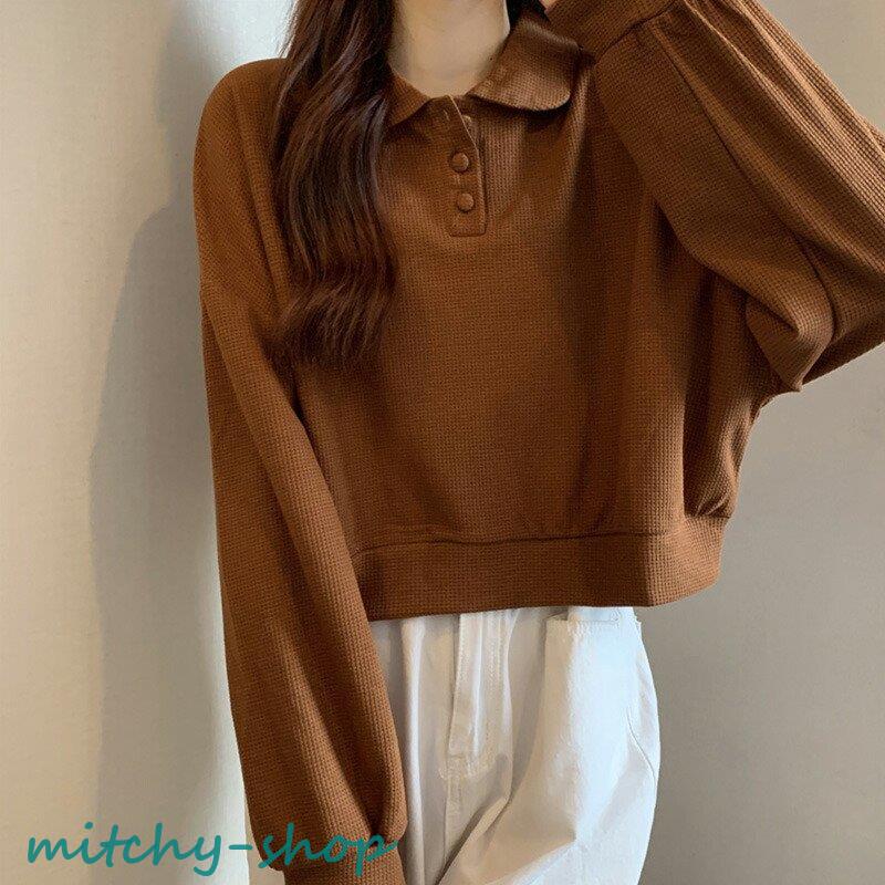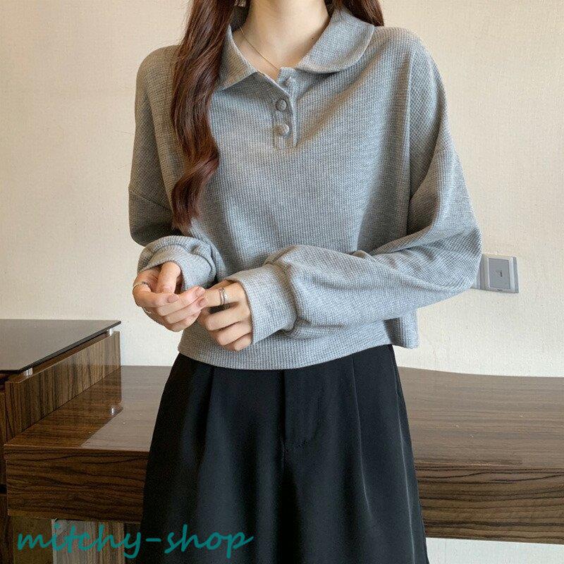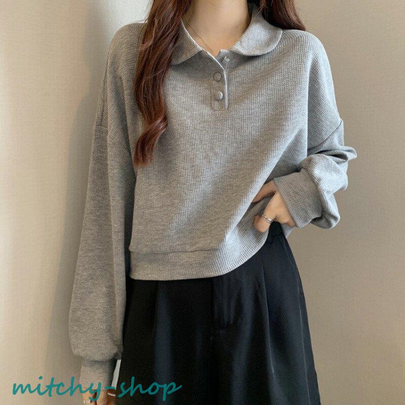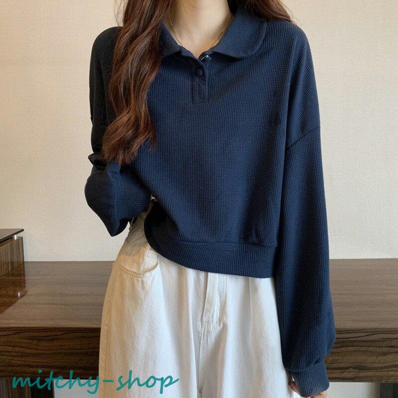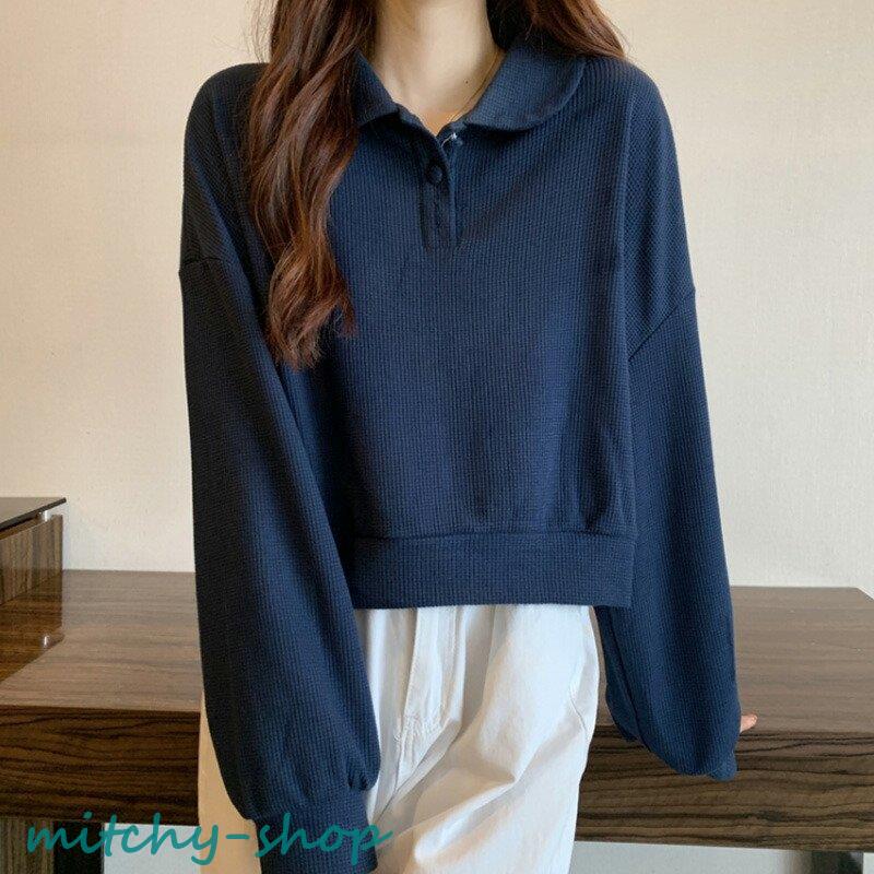 トップス ドロップショルダーポロトップス ショート丈カットソー 長袖 カットソー レディース ポロ バルーンスリーブ ゆったり