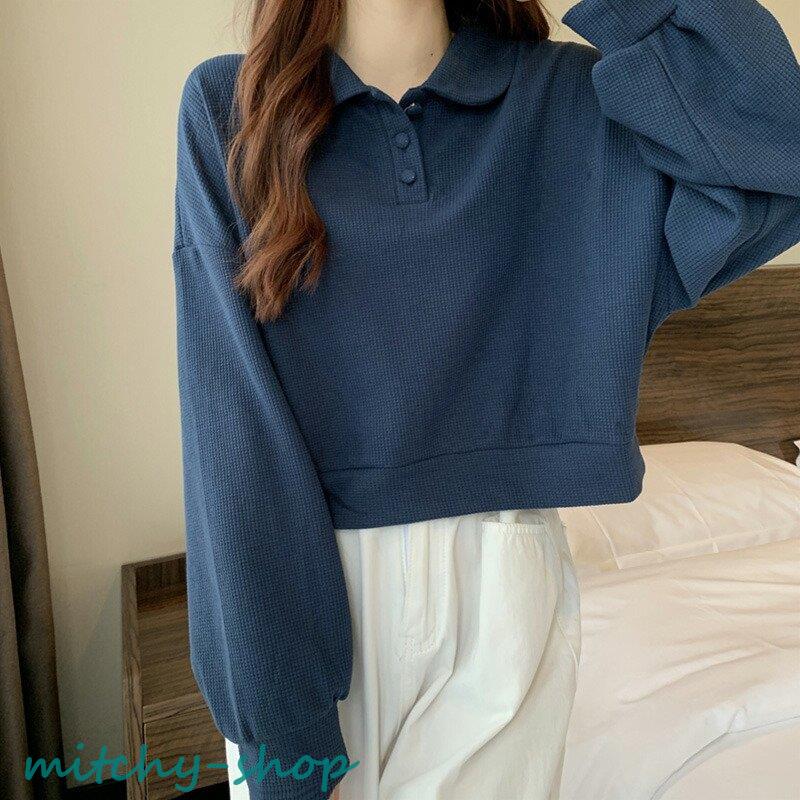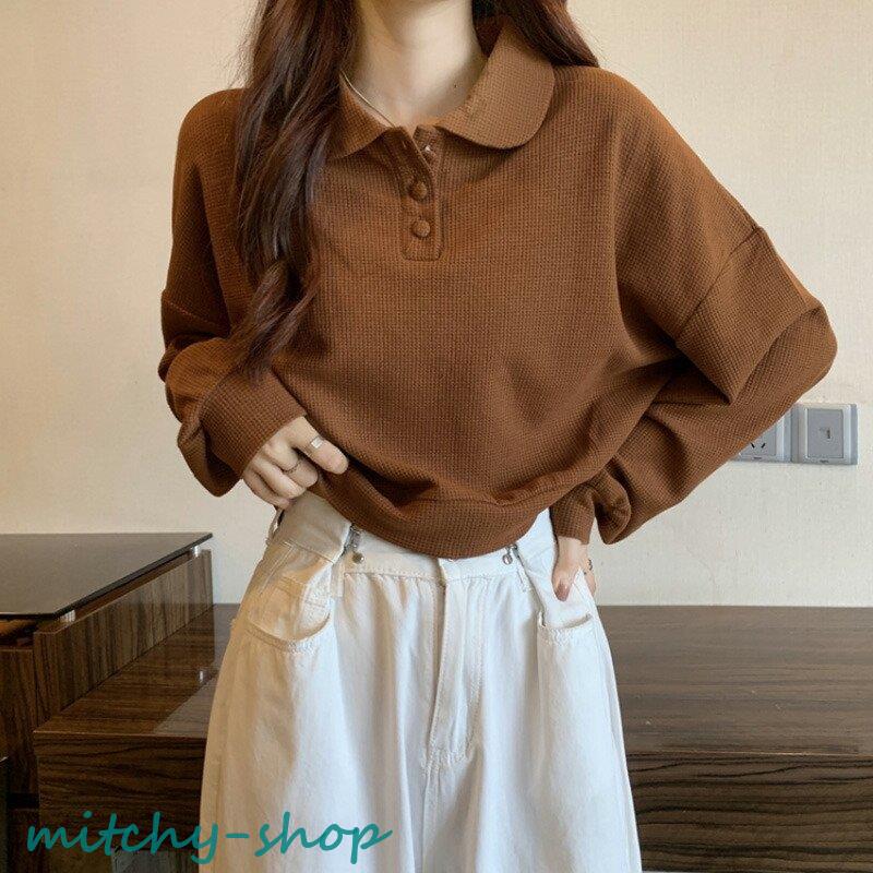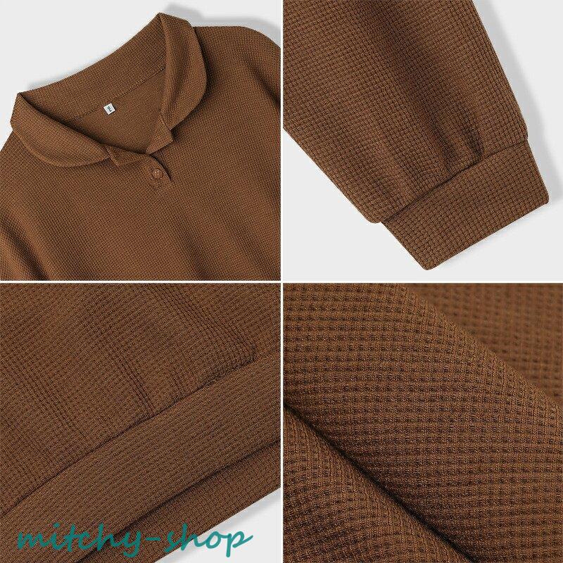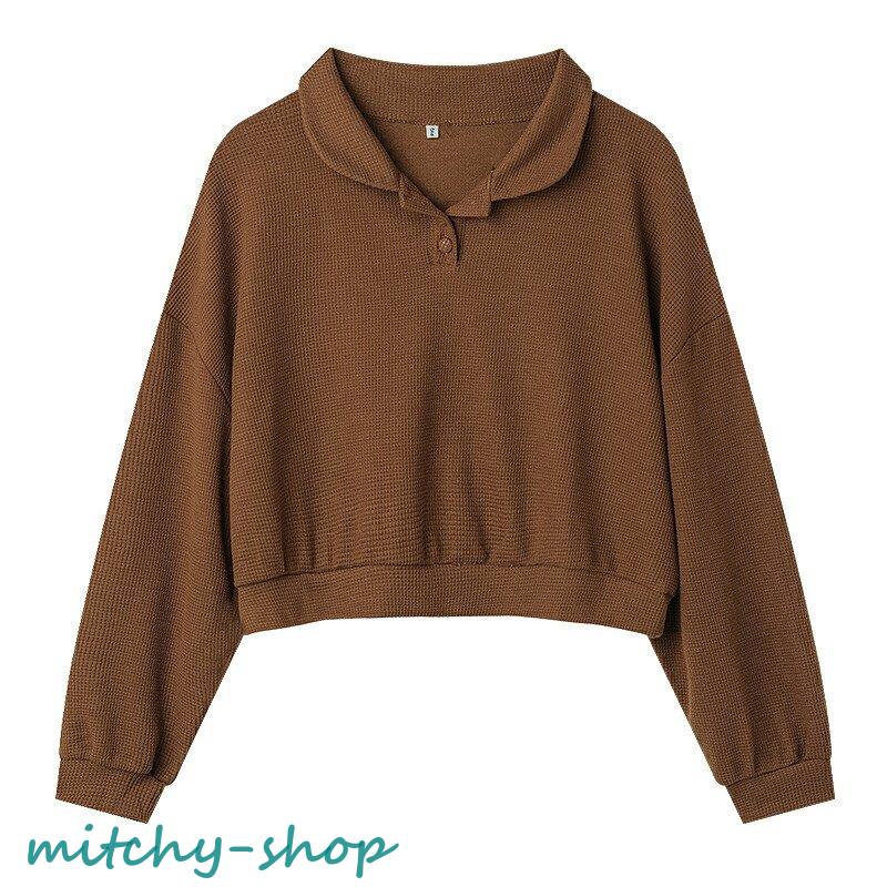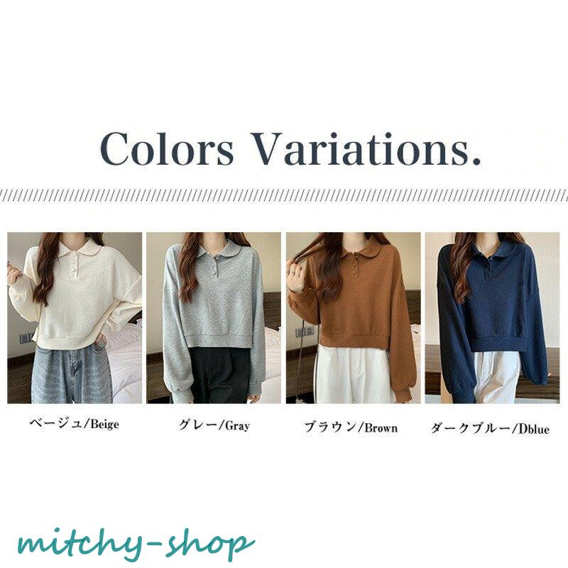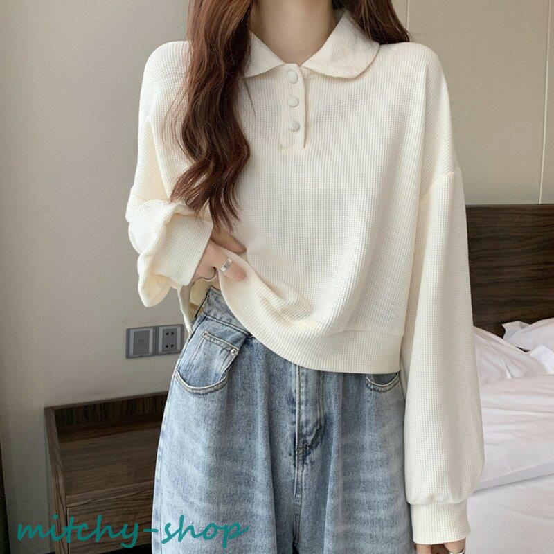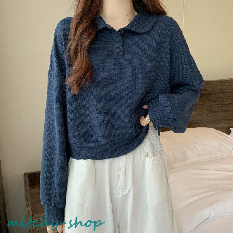トップス ドロップショルダーポロトップス ショート丈カットソー 長袖 カットソー レディース ポロ バルーンスリーブ ゆったり