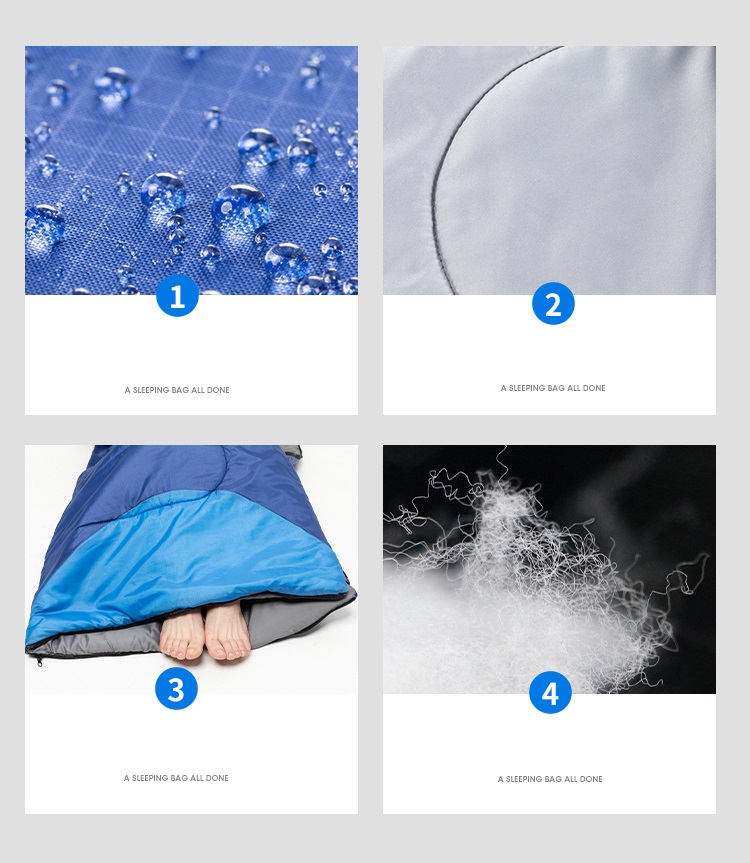 素材構成 側生地:さらさら190T高密度生地(ポリエステル100%) 撥水コーディング、耐裂性と速乾性に優れています。内生地:肌触りが良いソフト生地(ポリエステル100%)、柔らかくて快適な素材で、いつでも寝袋に入ると暖かい感じがします。中綿:防寒性能に優れたシルクコットンを採用しています。肌触りと寝心地がよいです。