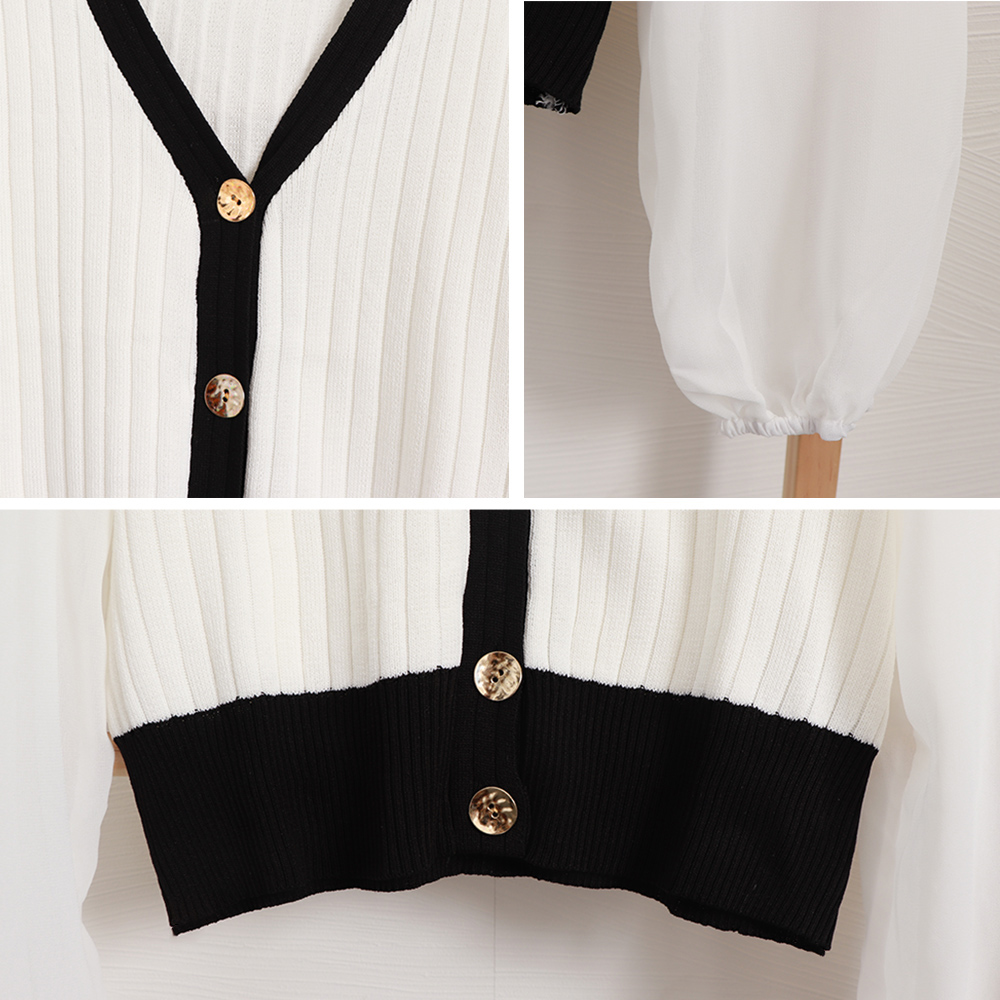 シフォンニット切り替え リブニット Vネック 女性 長袖 異素材ニットウェア ストレッチ シースルー 袖 ニットセーター