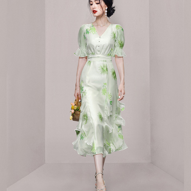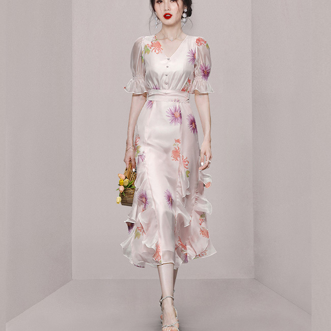 ドレスキャバ。花柄。上品でエレガントな半袖Aラインドレスです。デザインポイントはシャープなVネットラインです。