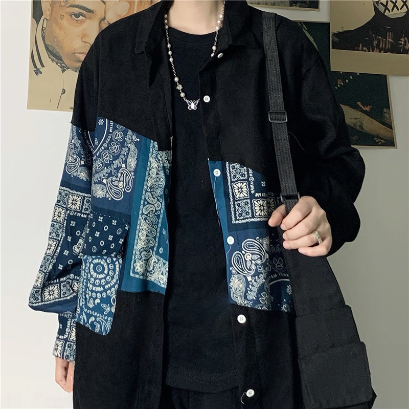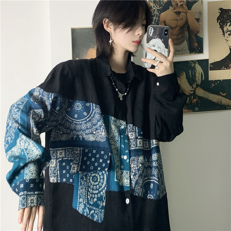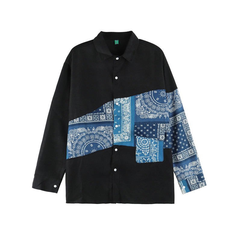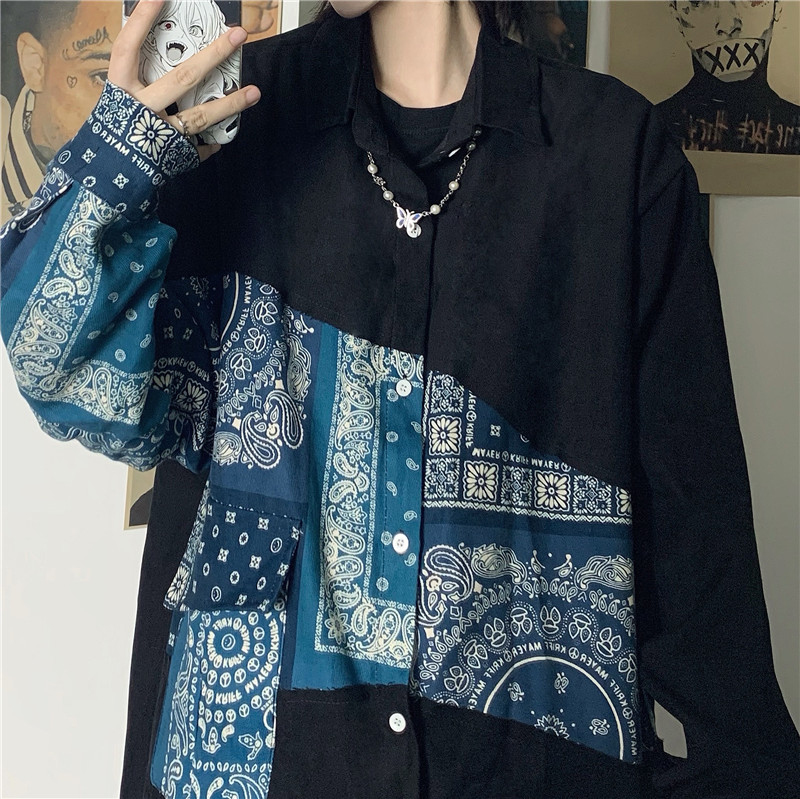 ダンス 衣装 ヒップホップ HIPHOP ユニセックス ブラウス シャツ 長袖 トップス カットソー 黒 ブラック 青 ブルー ペイズリー 柄シャツ おしゃれ 可愛い かっこいい 奇抜 派手 個性的 個性派 ストリート スケーター KPOP 大人 服 上 大きいサイズ ビッグ ゆったり 長め