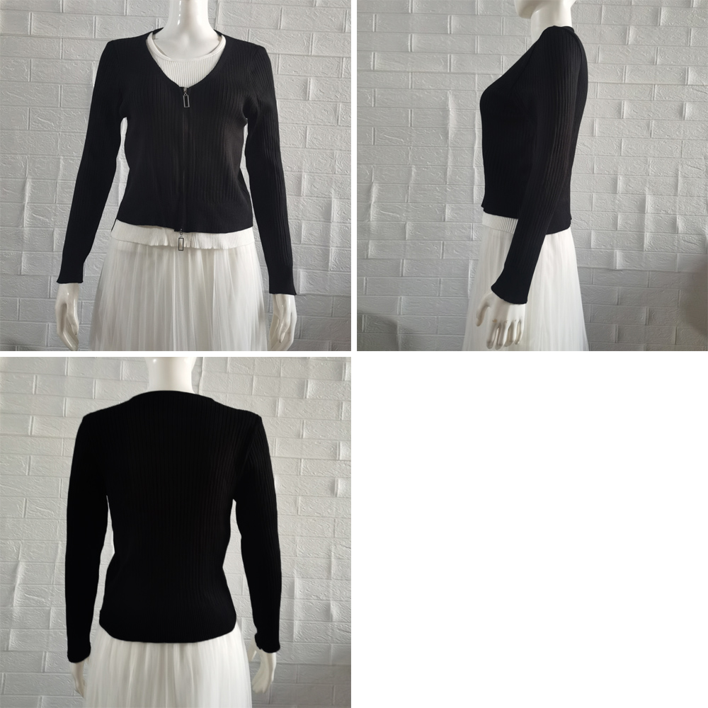 伸縮性の良いリブニット仕上げ、程良くボディラインにフィットする