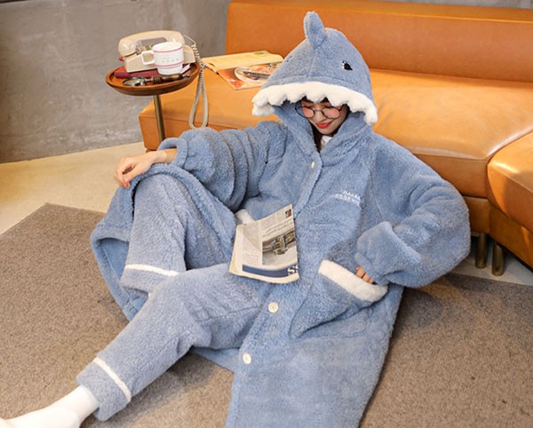 もこもこパジャマ ナイトガウン レディース サメ柄 冬 かわいい 上下ゼット 長袖 ルームウェア フード付き 着る毛布 もこもこ パジャマ 部屋着 寝間着 おうち時間 女性用 ふわふわ 前開き 韓国 暖かい モコモコ あったか プレゼント 結婚祝い ブルー 個性的 目立つ系 N1X0