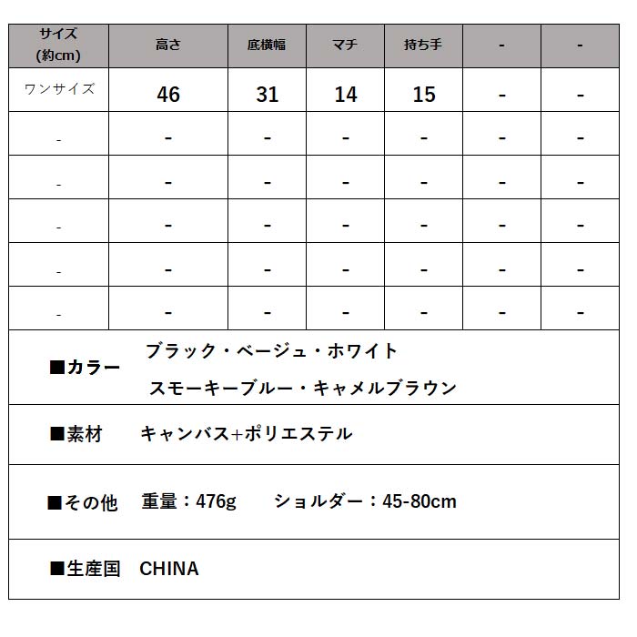 高さ:約46CM 底横幅:約31CM マチ:約14CM 持ち手:約15CM(調節不可、取り外し不可) ショルダー:約45-80CM(調節可、取り外し不可)