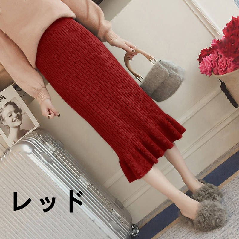 お取り寄せ商品 スカート レディース フレアスカート 6COLORS M-2XL ミディアム丈 セータースカート 膝下 フリル ひざ下 ニットスカート シンプル