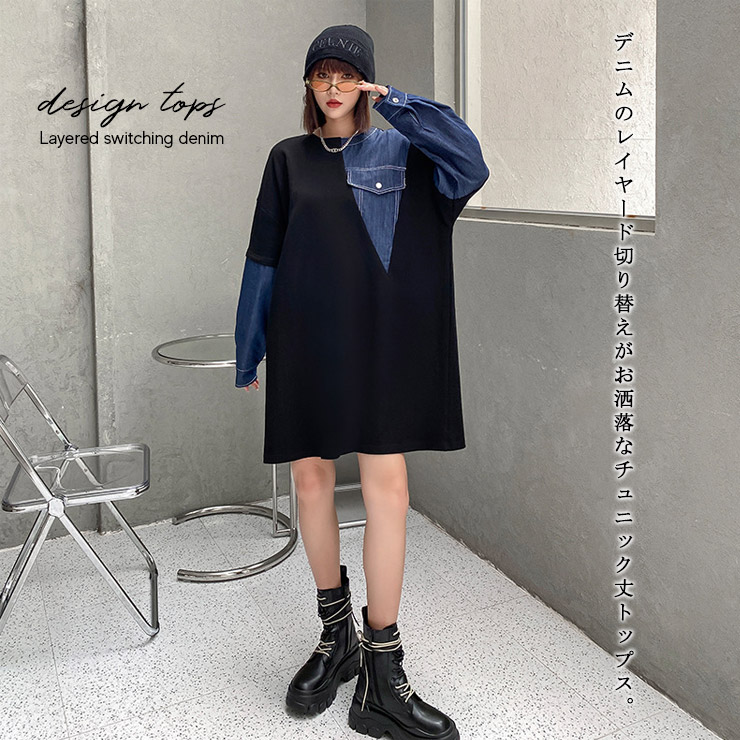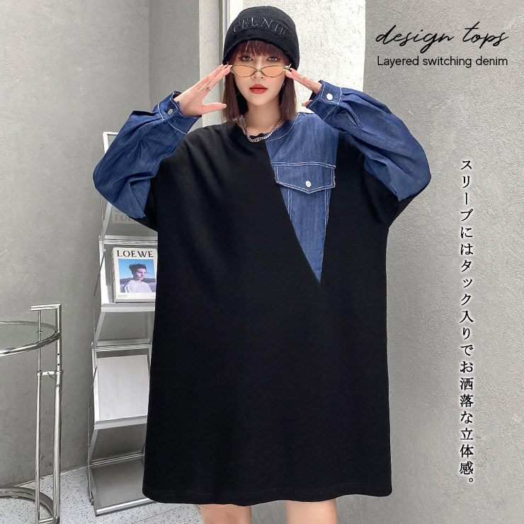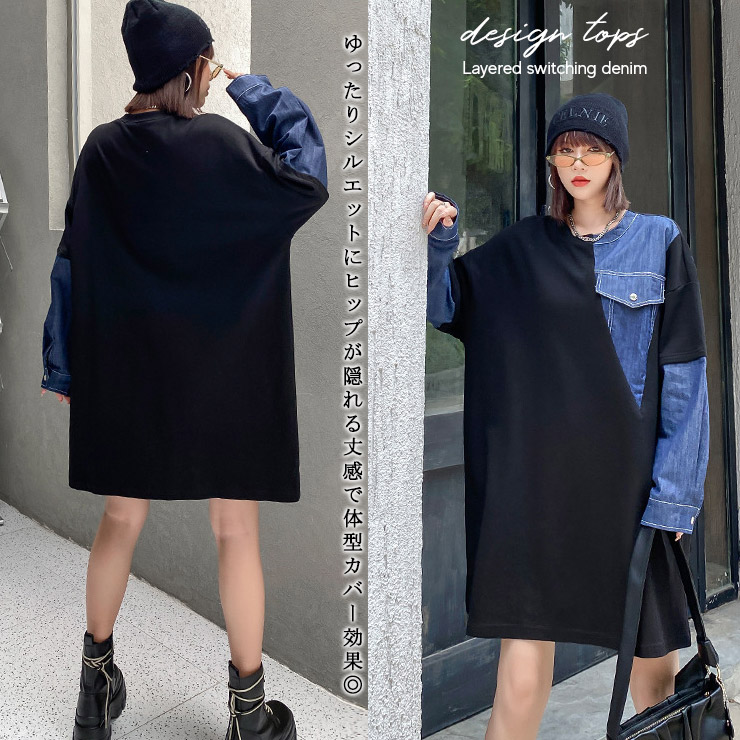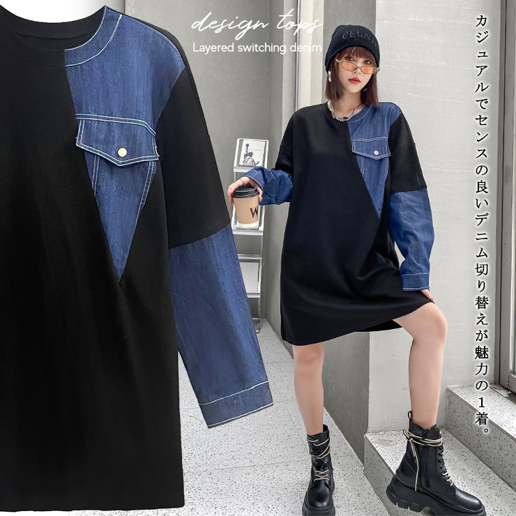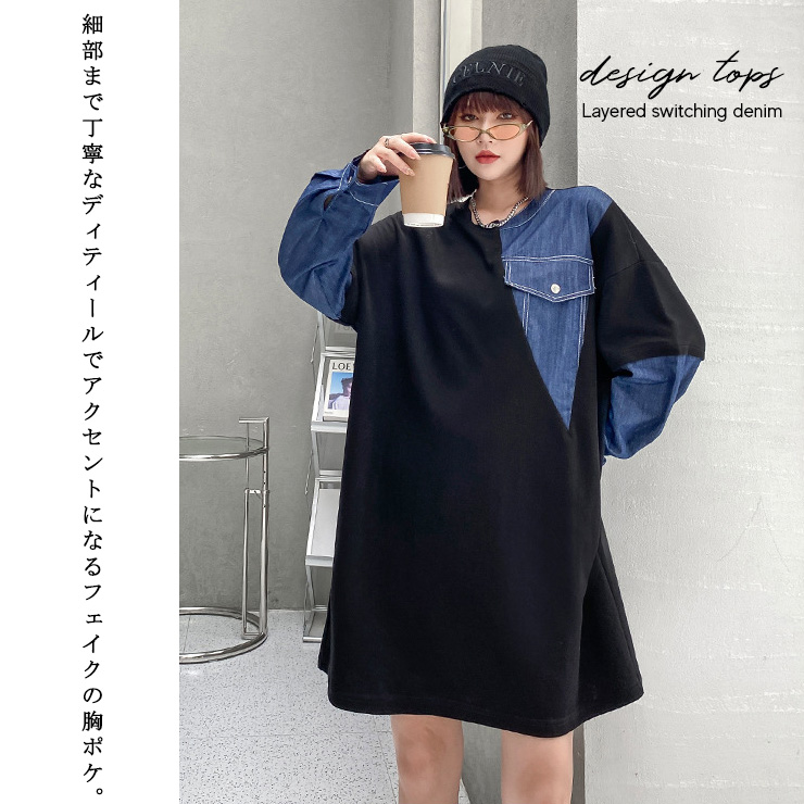 ★☆大きいサイズ レディース デニム切替トップス オーバーサイズ 長袖 チュニック丈 黒 ロンT 春 秋 LL 3L 4L 5L 6L ブラック 新入荷 。可☆★