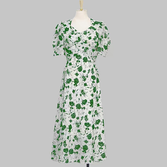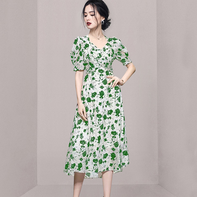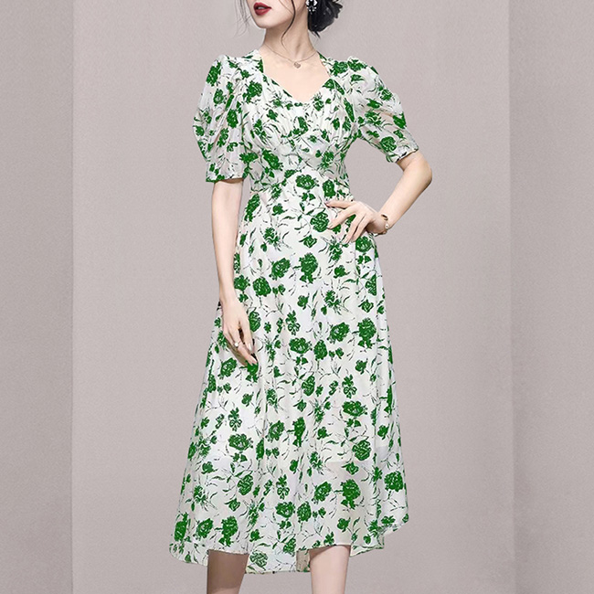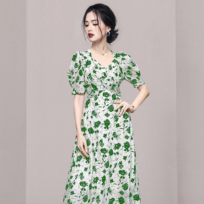 ドレスキャバ。花柄。上品でエレガントな半袖ドレスです。デザインポイントは胸元のシャープなVカットとパフスリーブです。