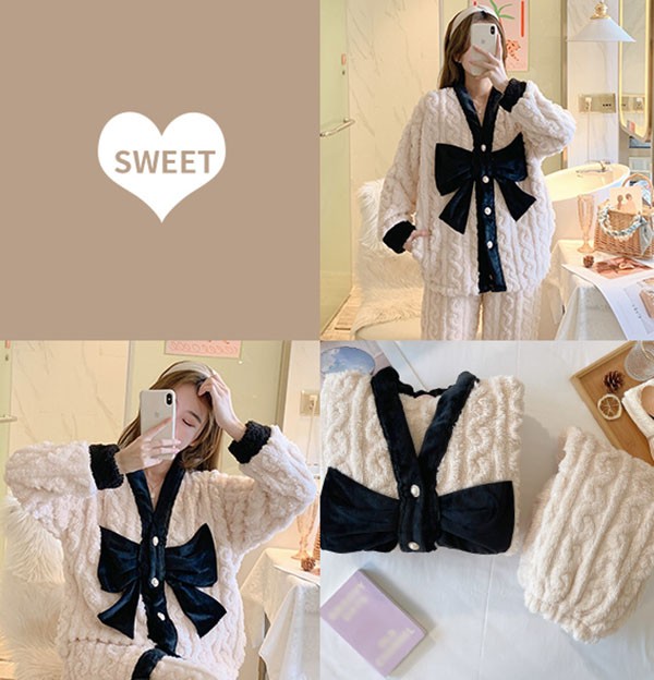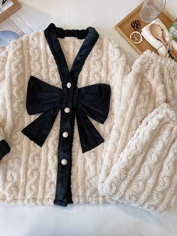 もこもこパジャマ レディース ビッグリボン 冬 かわいい 長袖 プレゼント 上下セット 可愛
