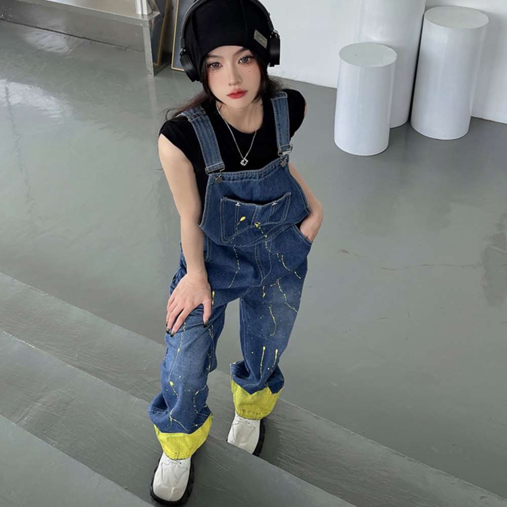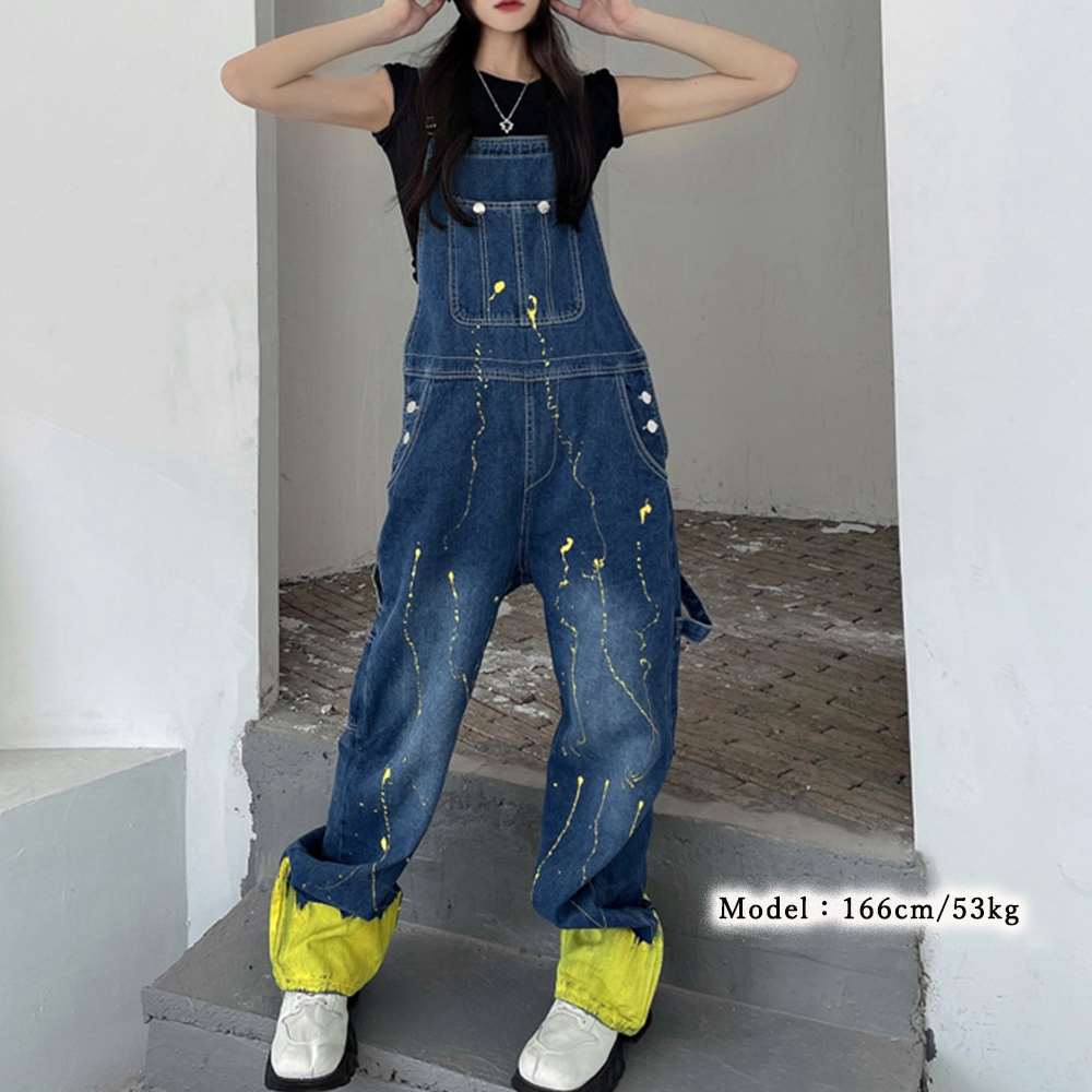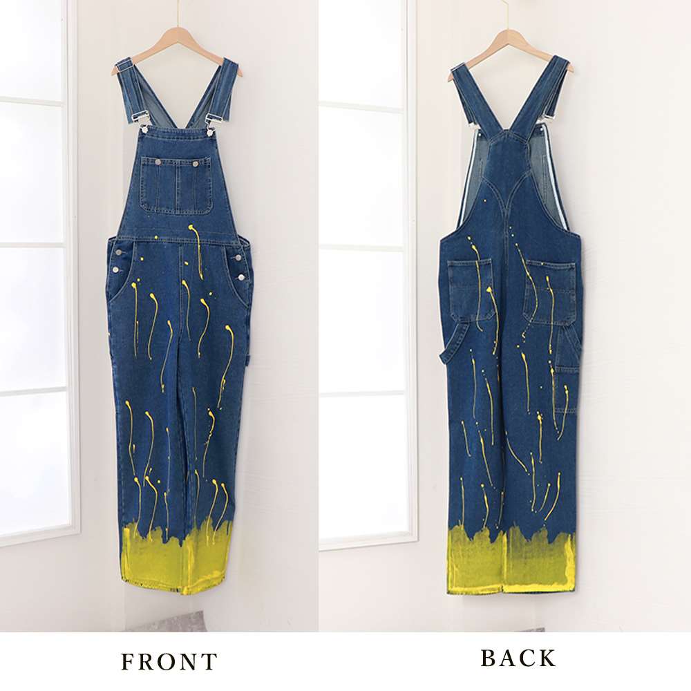 ペンキを飛ばしたようなデザインの。デニムオーバーオール