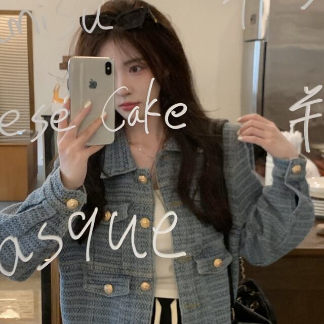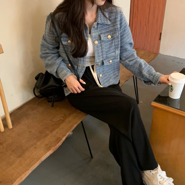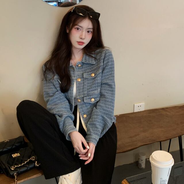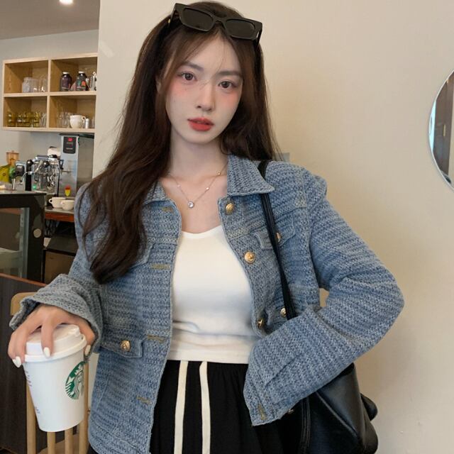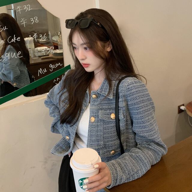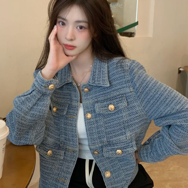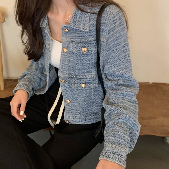 ジャカードデニムの生地と金ボタンが華やかなデニムジャケット♪