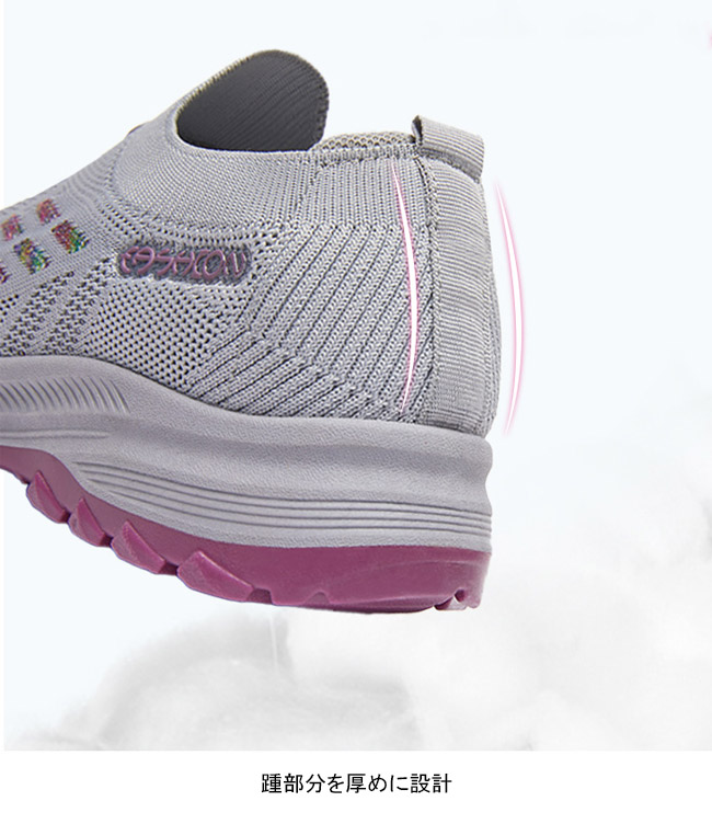 生地の伸縮性のある靴口により、足に空きスペースを提供、紐がないから着脱が楽。