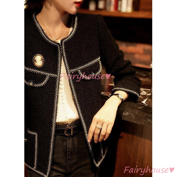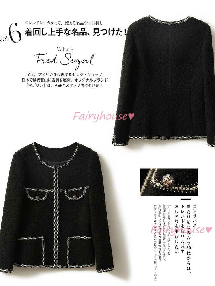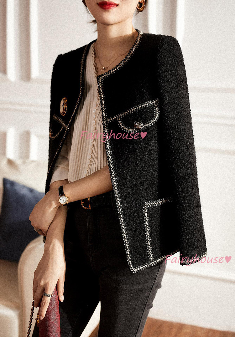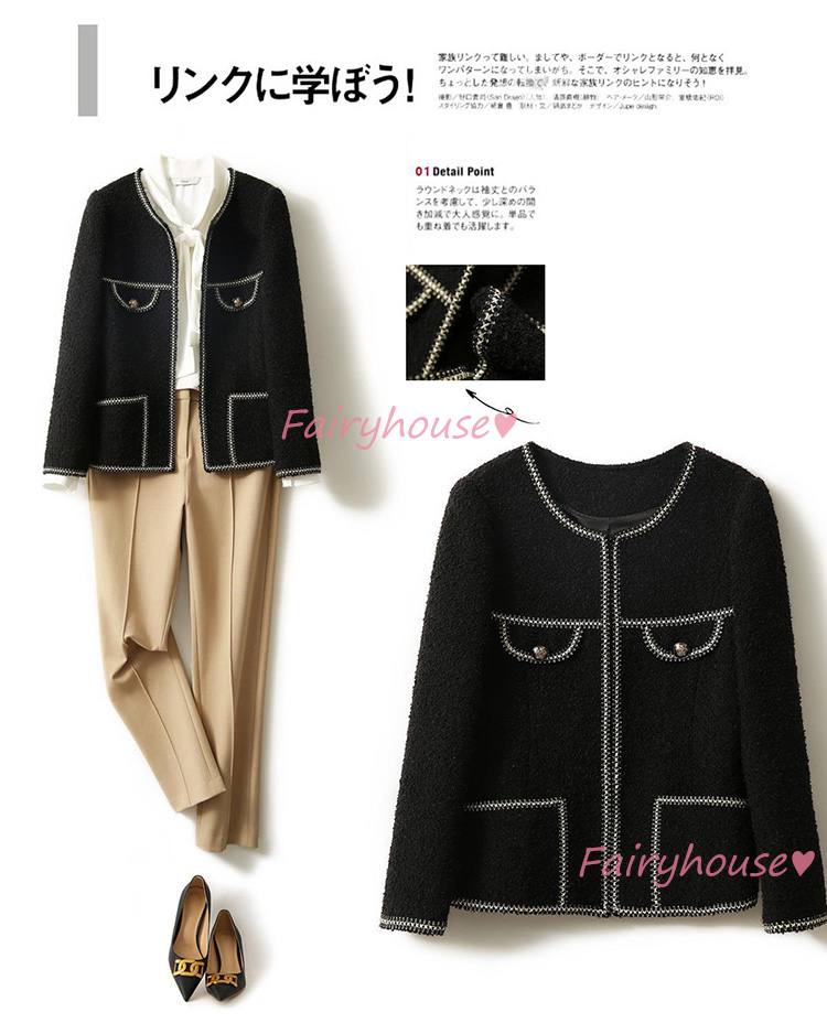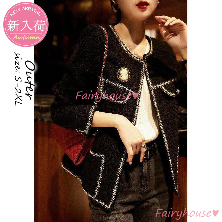 連携キーワード :ツイードジャケット レディース 40代 長袖ノーカラージャケット 黒 ショット丈ツイードコート 春コートアウター 秋服 大人韓国風 通勤OL オフィス 結婚式 入学式 卒業式 30代 50代