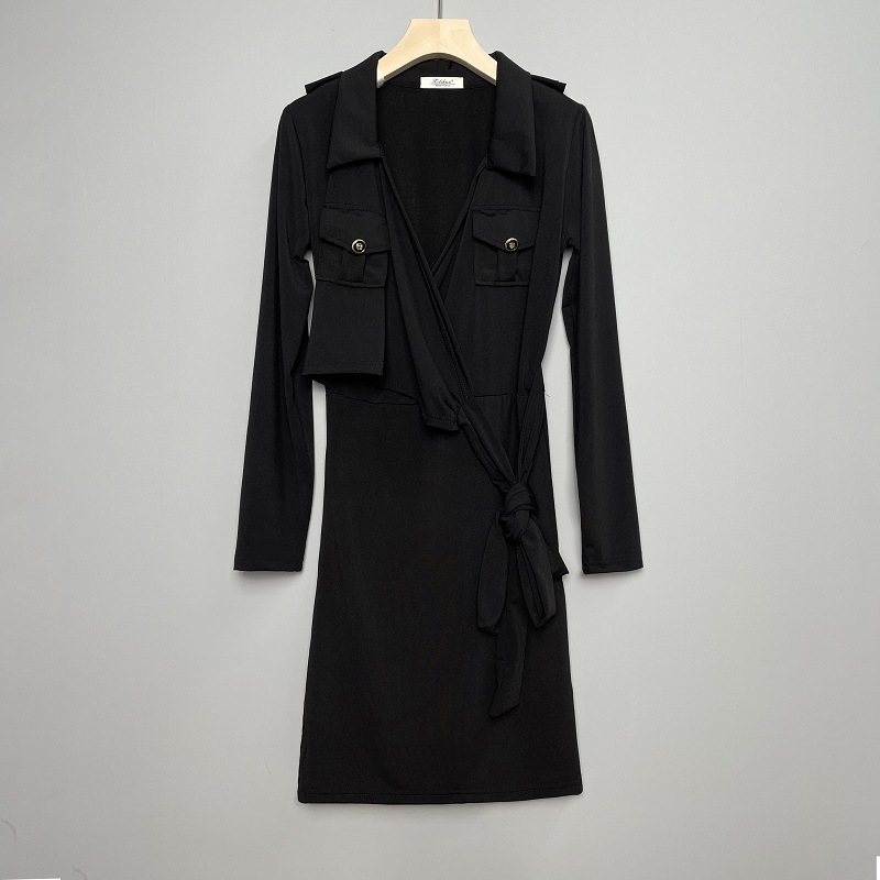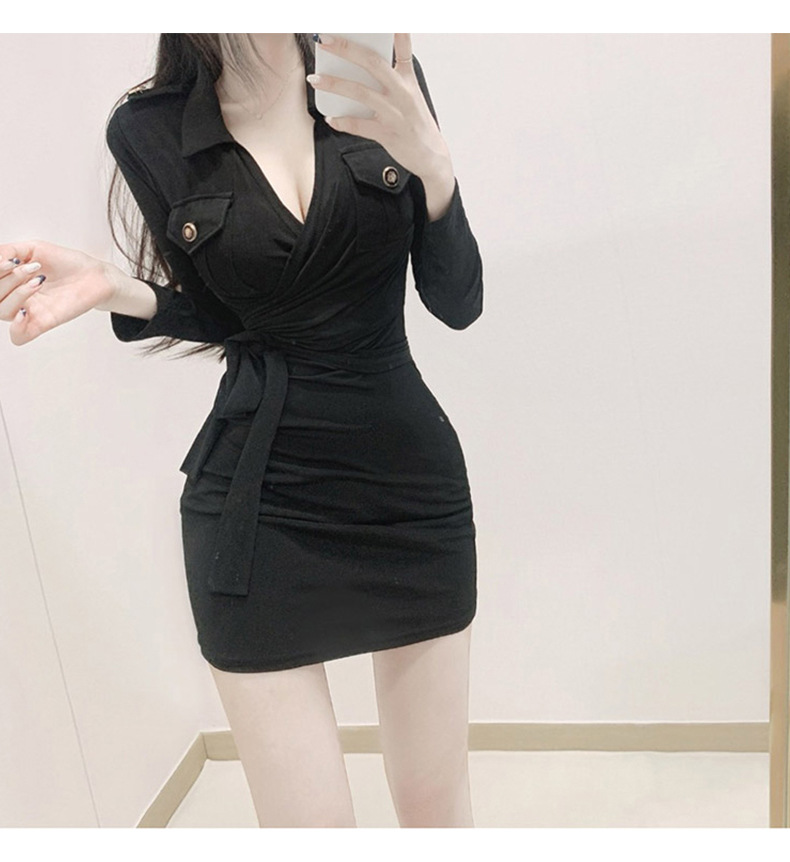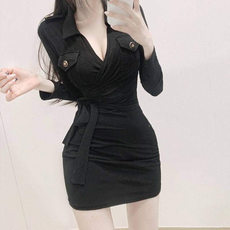 キャバ ドレス キャバドレス ミニ キャバクラ キャバワンピース おしゃれ ミニワンピース ひも付き タイト 襟付き 深いVネック 長袖 セクシー