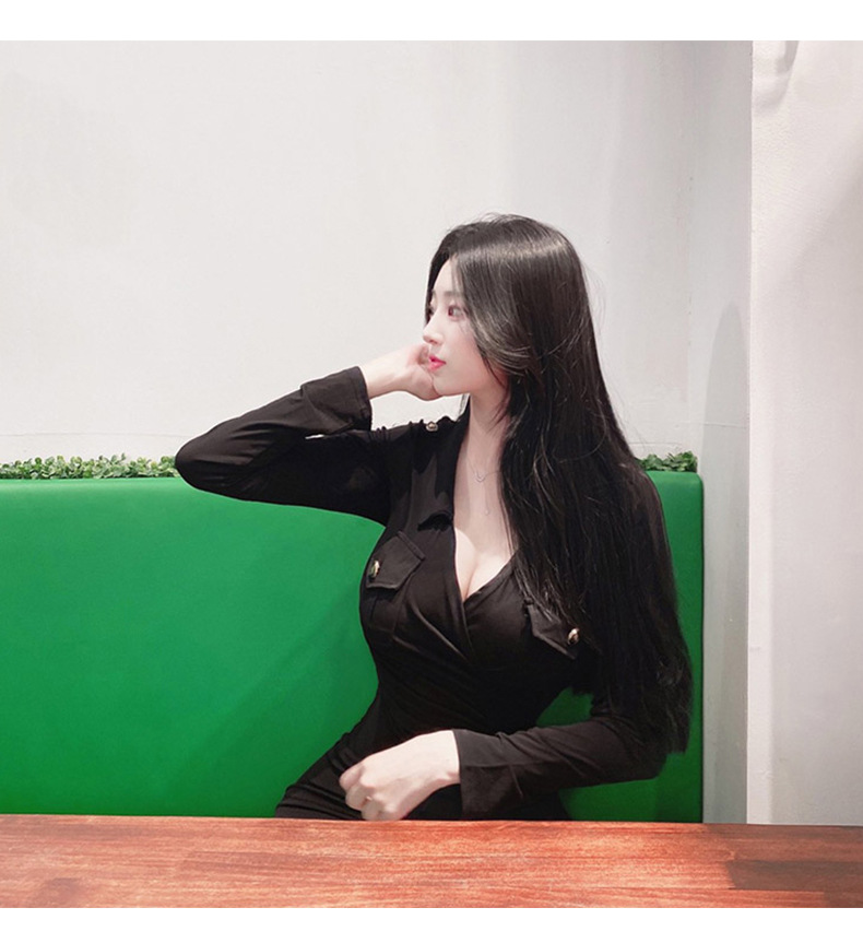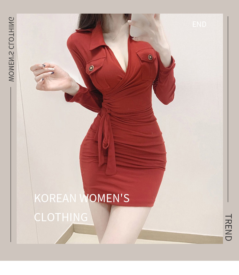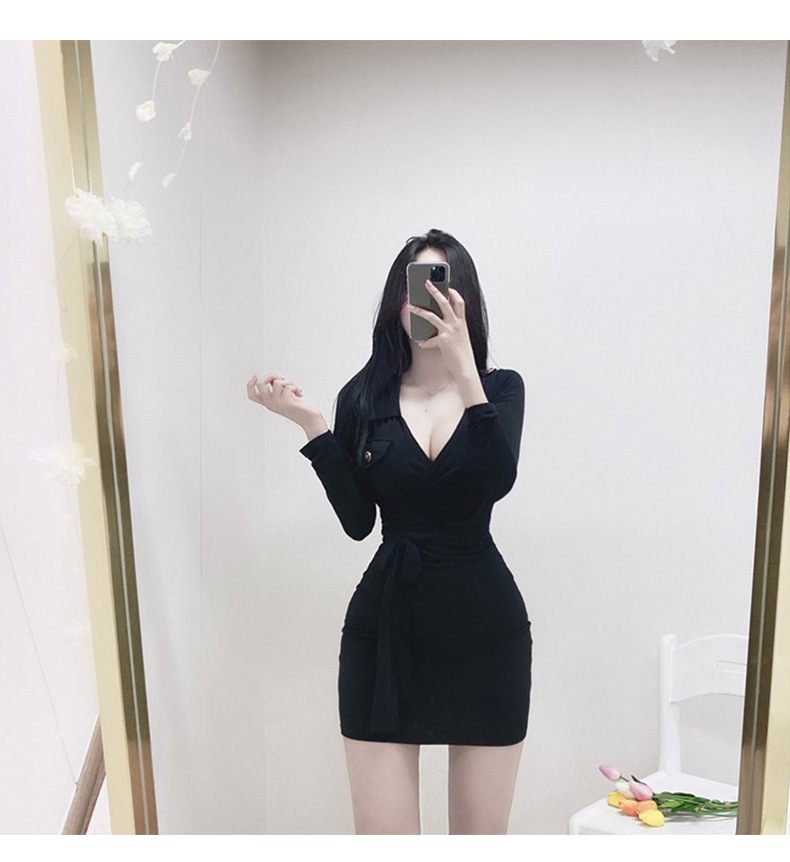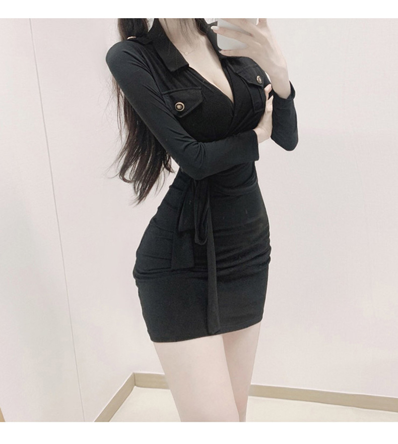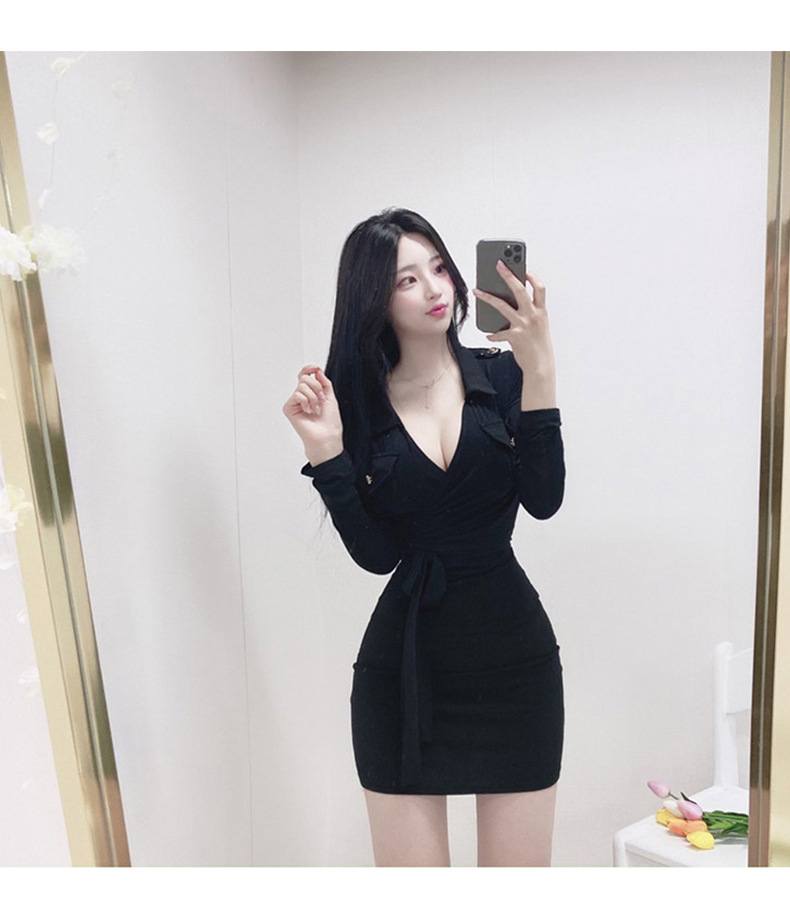 キャバ ドレス キャバドレス ミニ キャバクラ キャバワンピース ミニワンピース 長袖 タイト 襟付き おしゃれ 深いVネック セクシー ひも付き