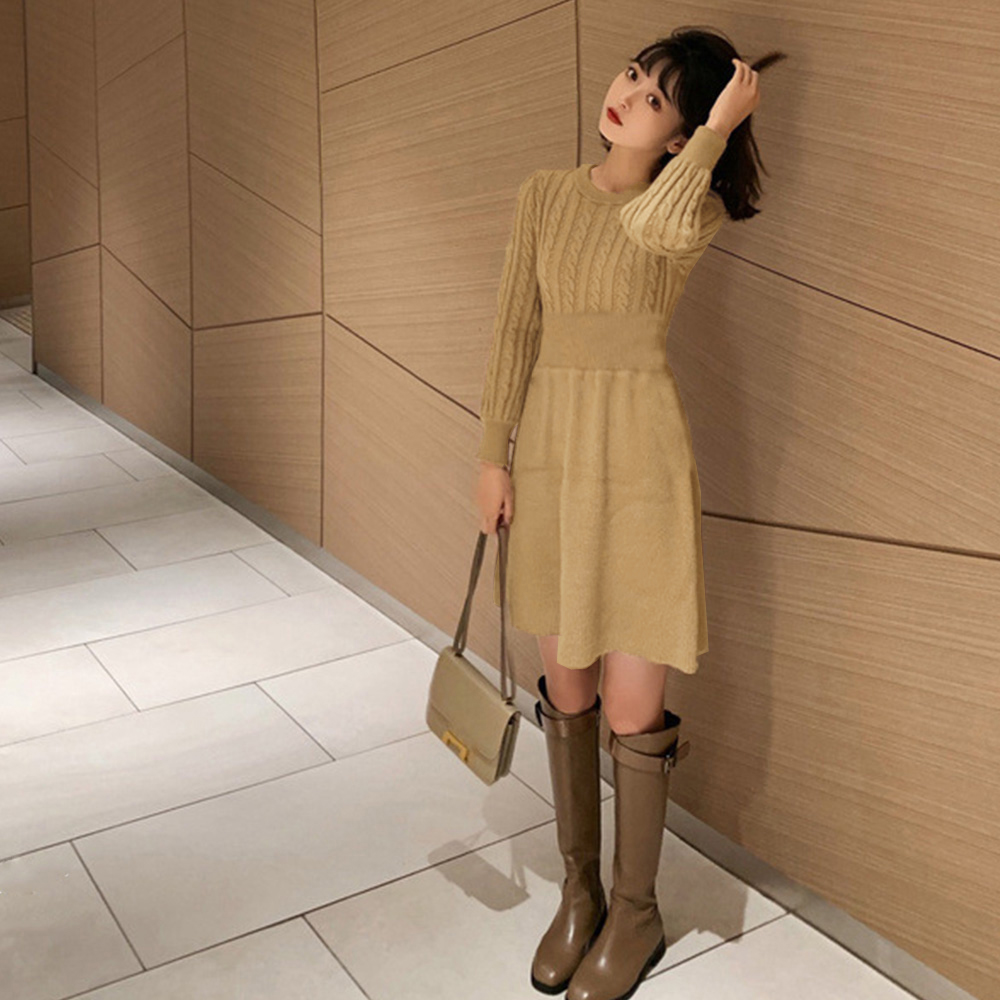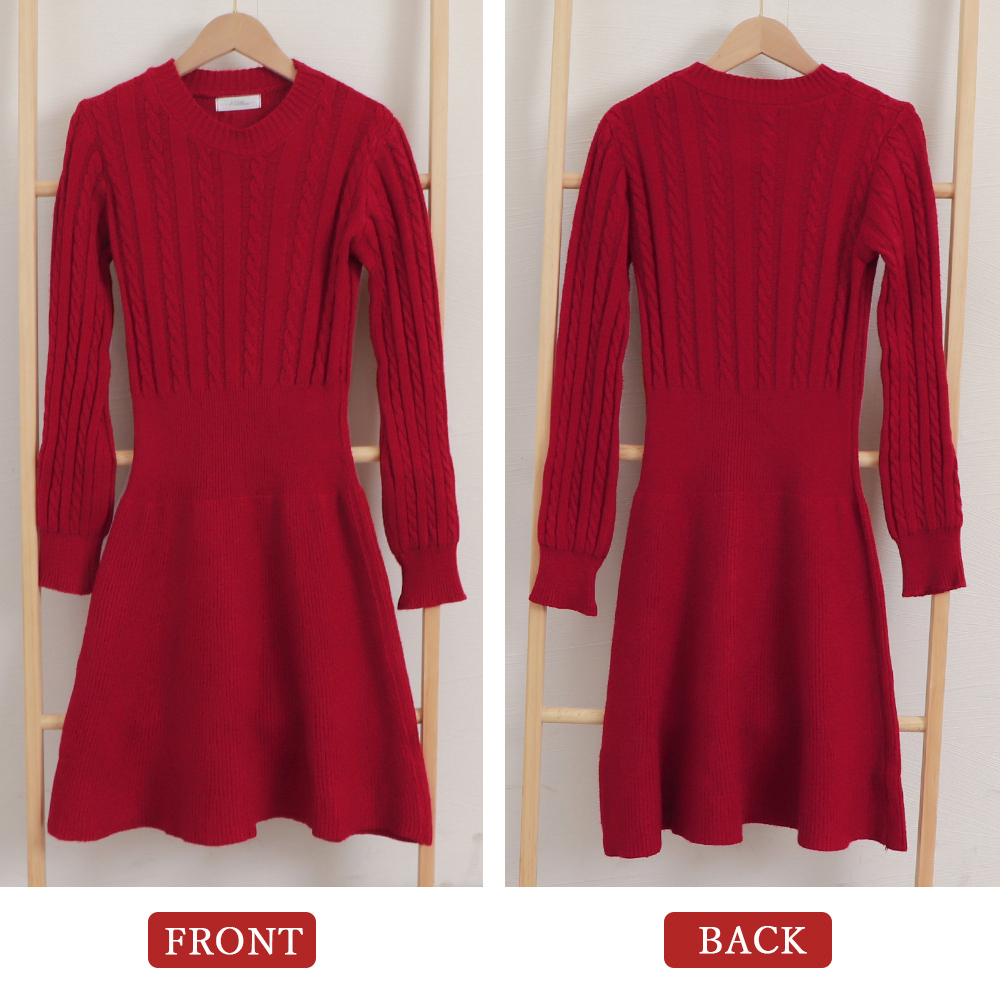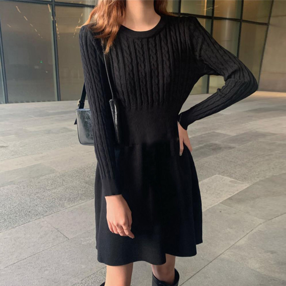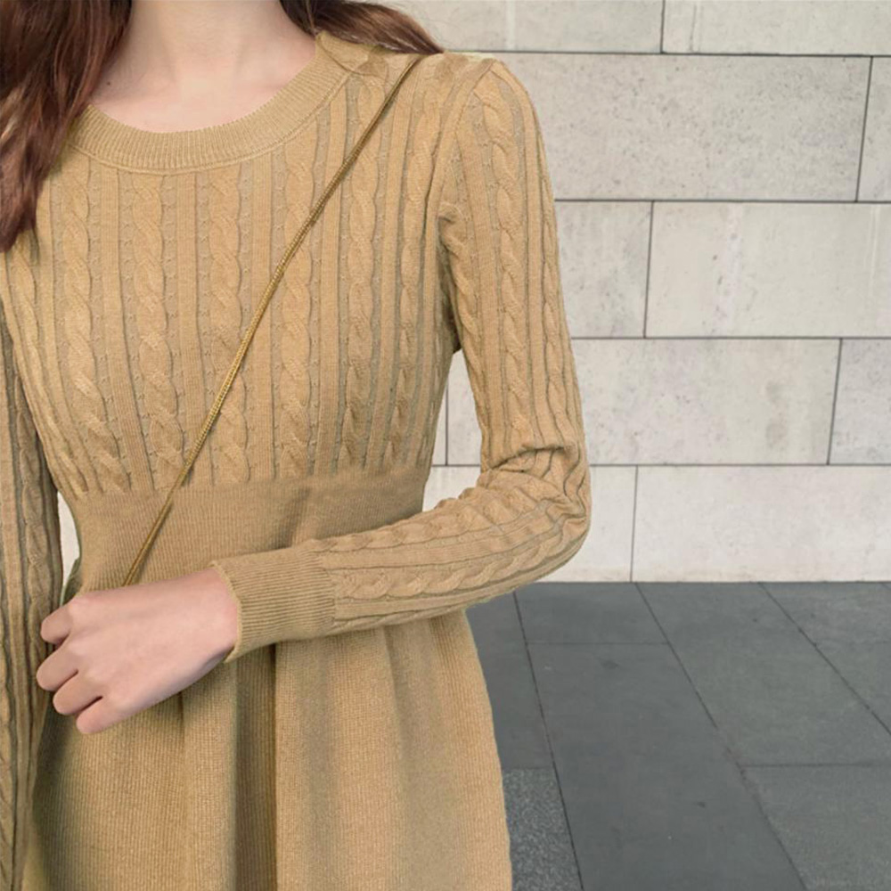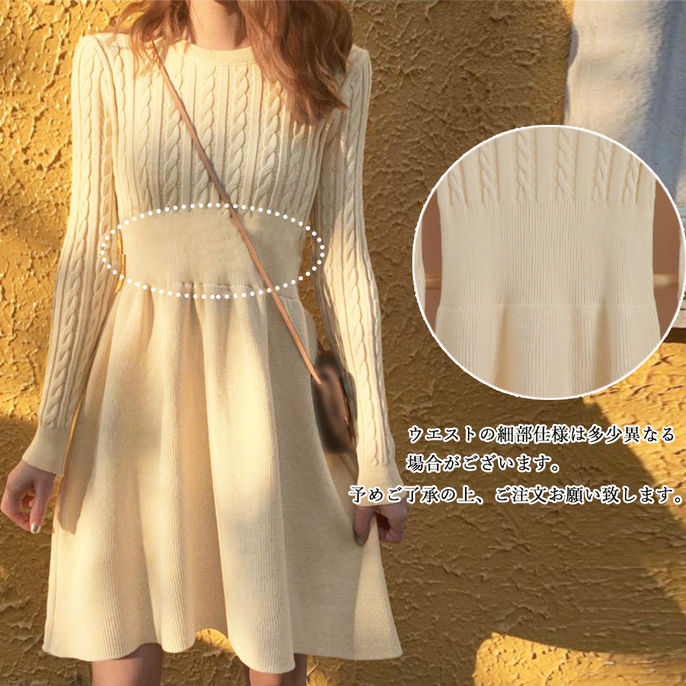 ウエストマーク Aラインワンピース 通勤通学 フレアワンピース シンプル ハイウエスト 長袖 膝上丈ワンピース 秋冬無地