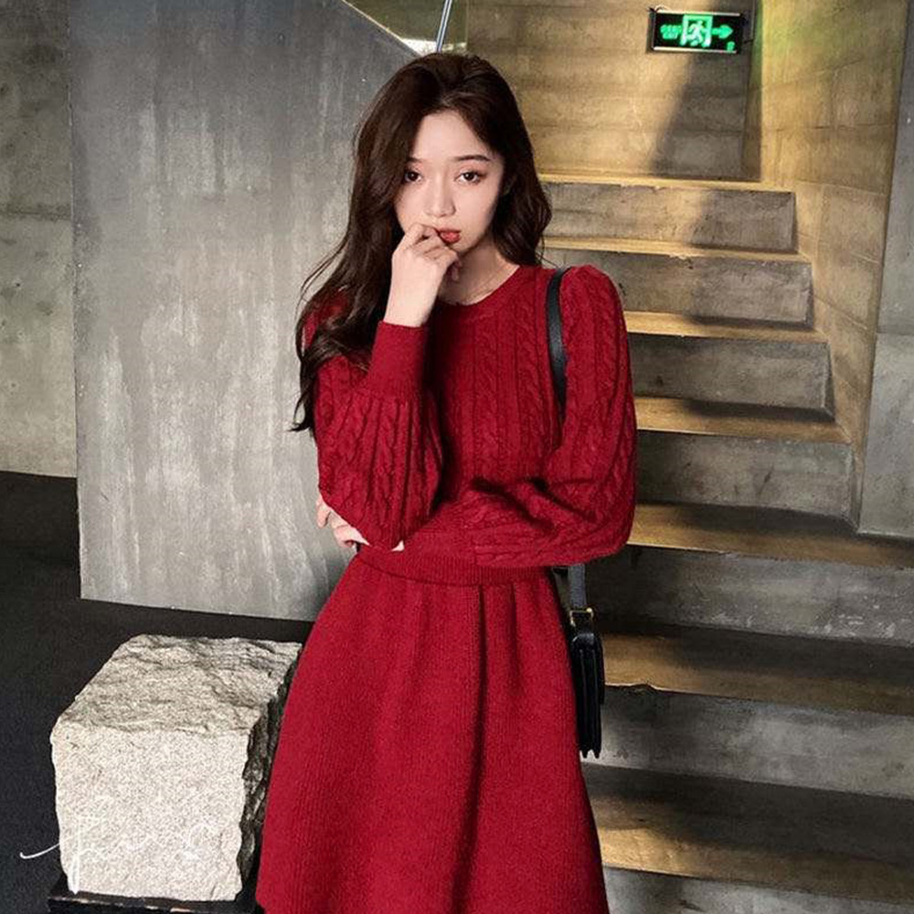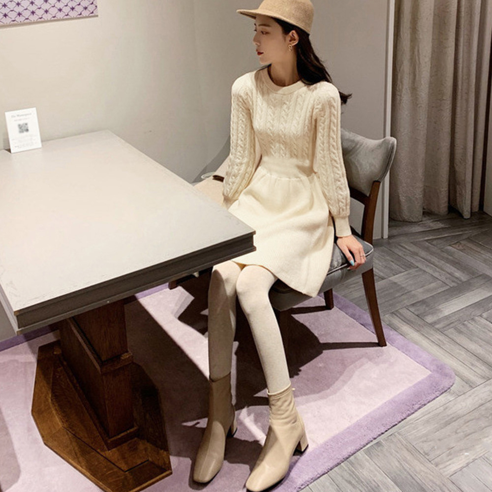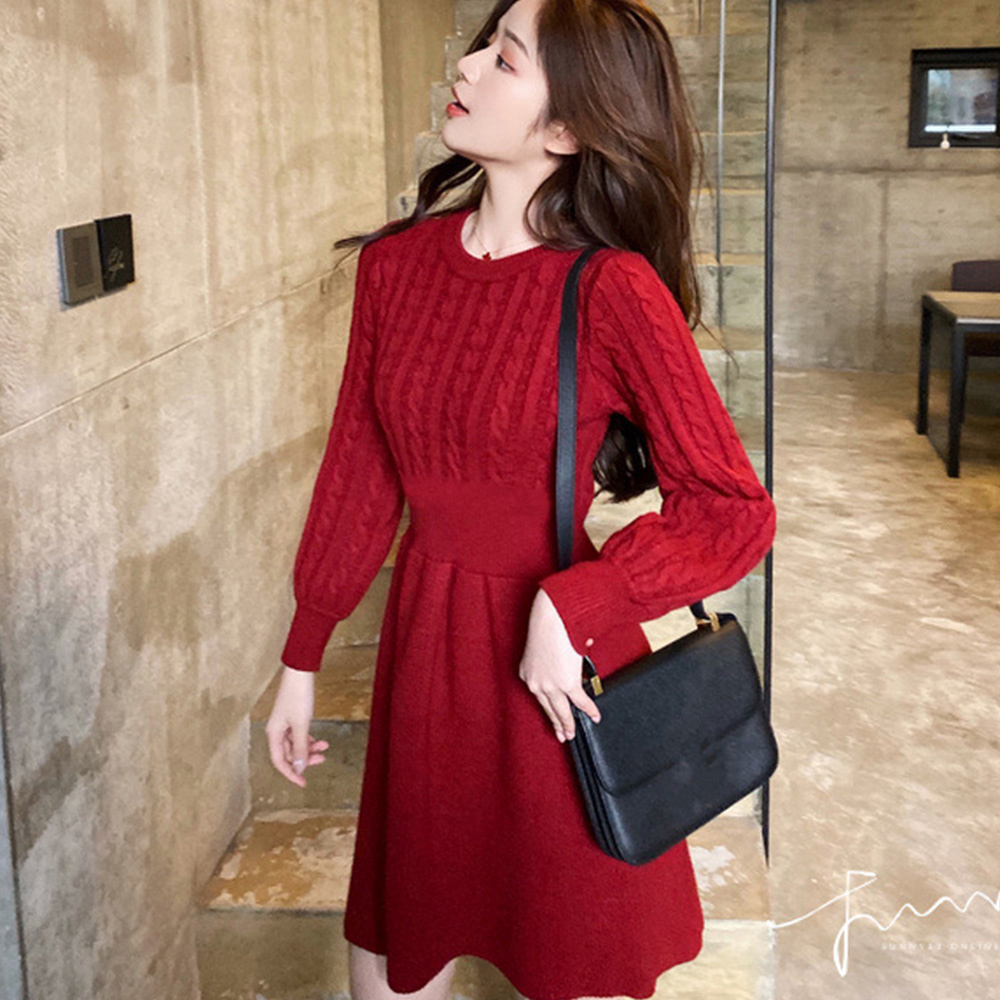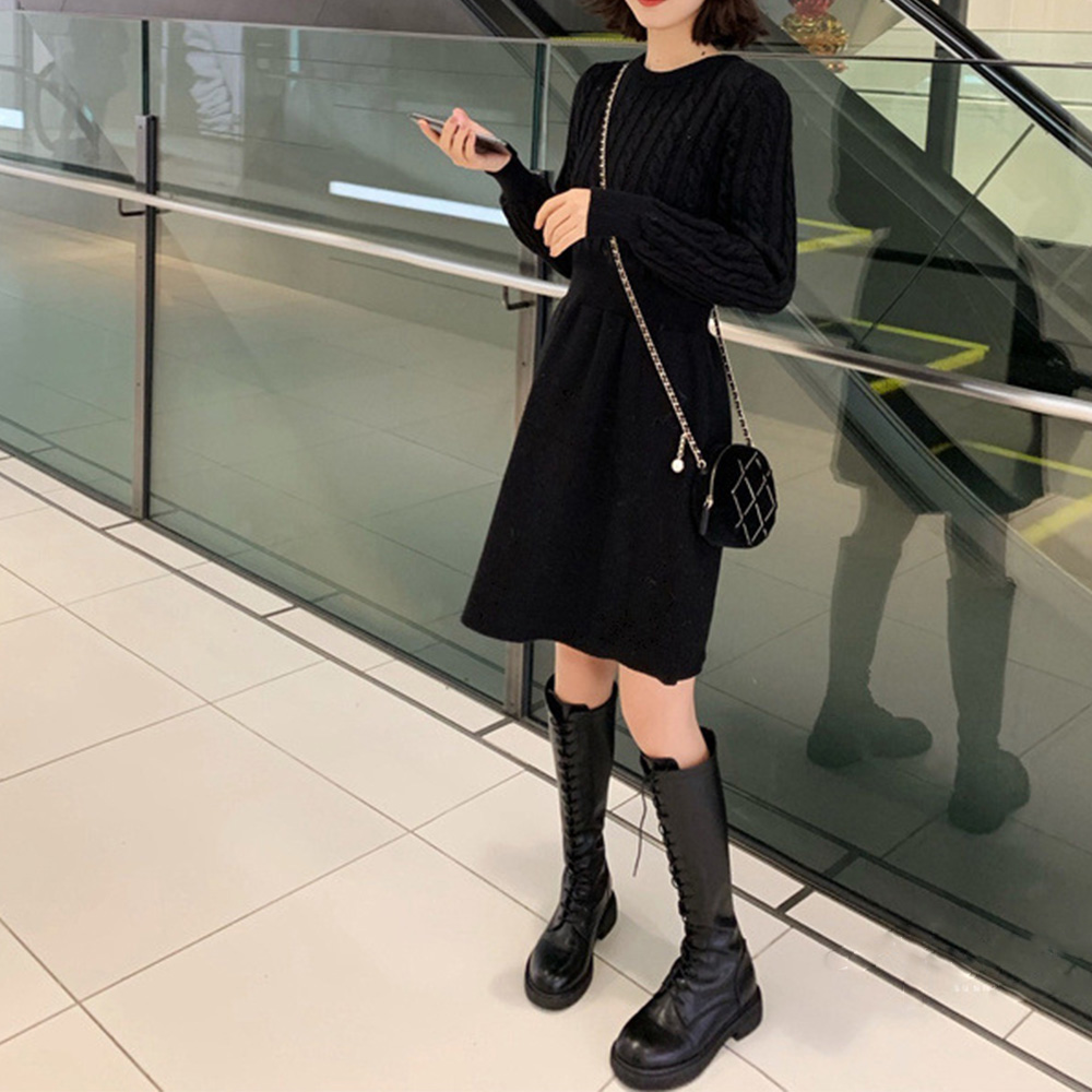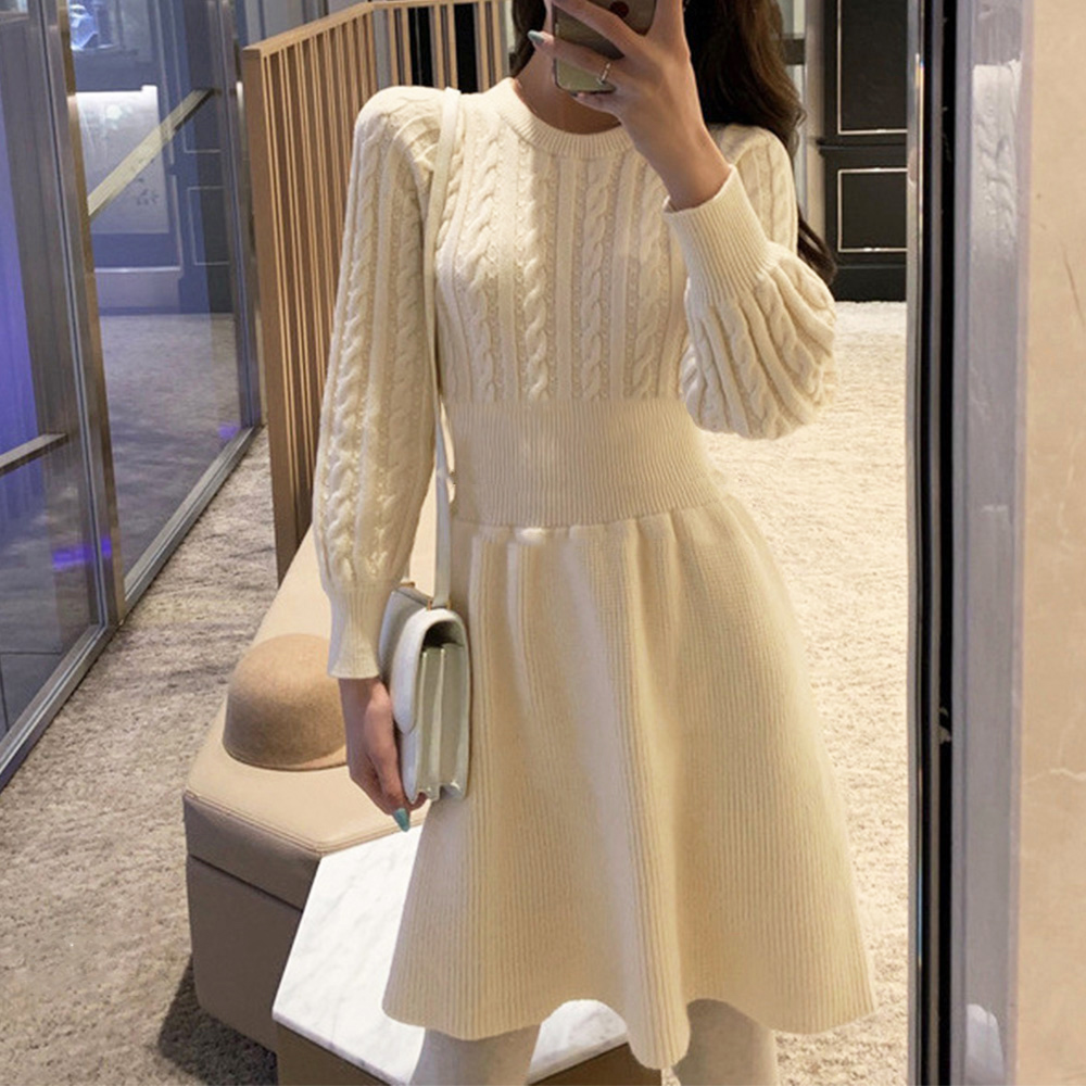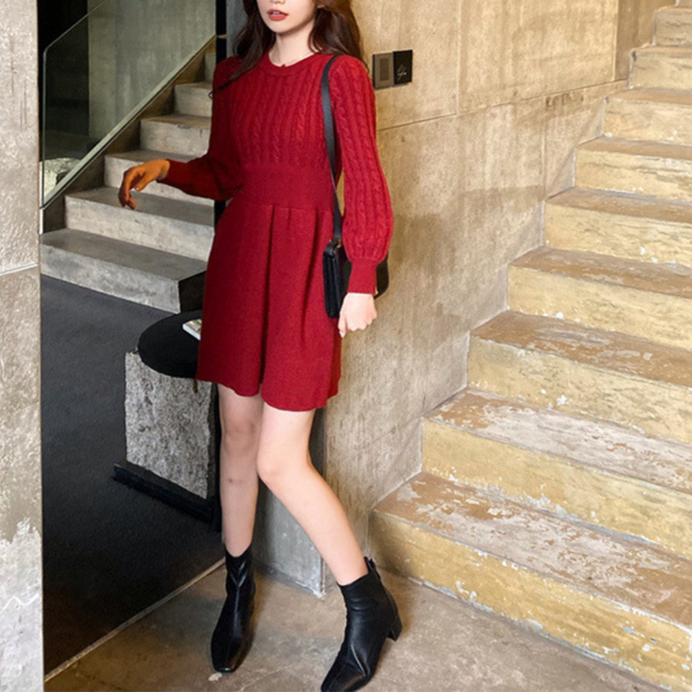 ウエストマーク Aラインワンピース 通勤通学 フレアワンピース シンプル ハイウエスト 長袖 膝上丈ワンピース 秋冬無地