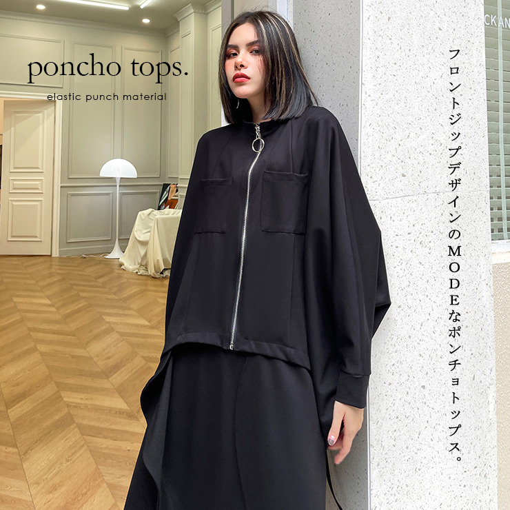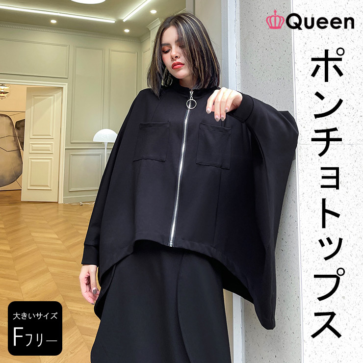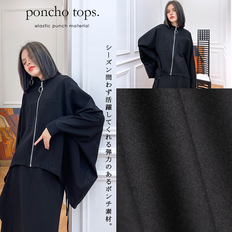 ★☆大きいサイズ レディース ポンチョ オーバーサイズ 長袖 ジップ 黒 ショート丈 フードなしアウター 春 秋 LL 3L 4L 5L 6L ブラック 新入荷 。可☆★