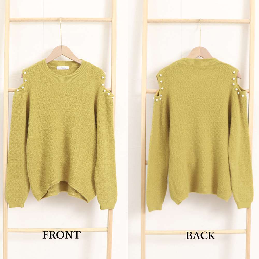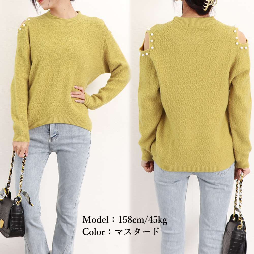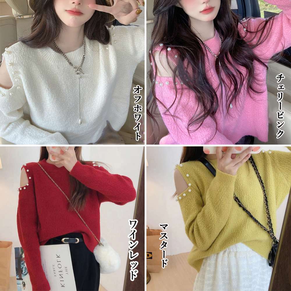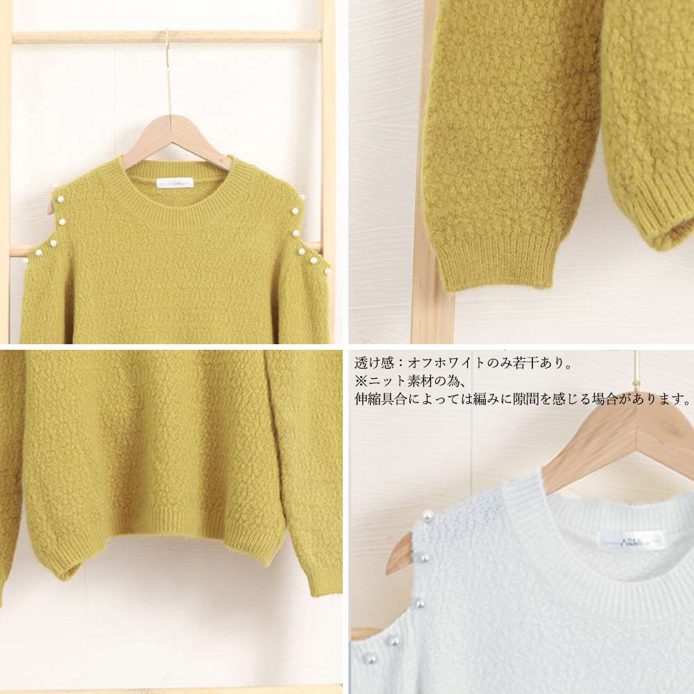 パールをあしらった肩開きデザインである肌見せに大人可愛い長袖ニットトップスです