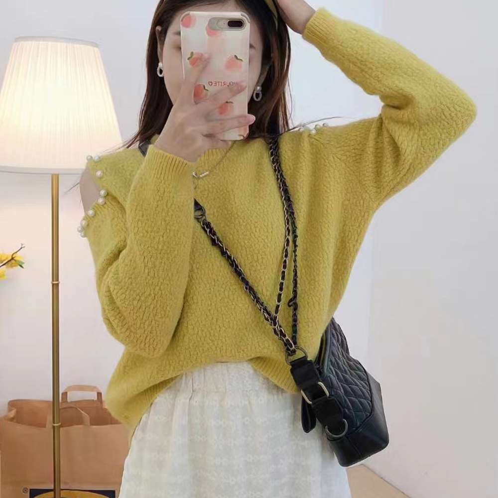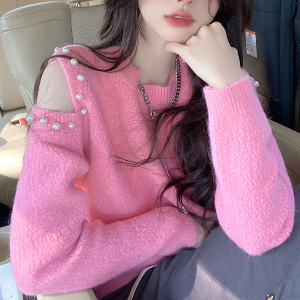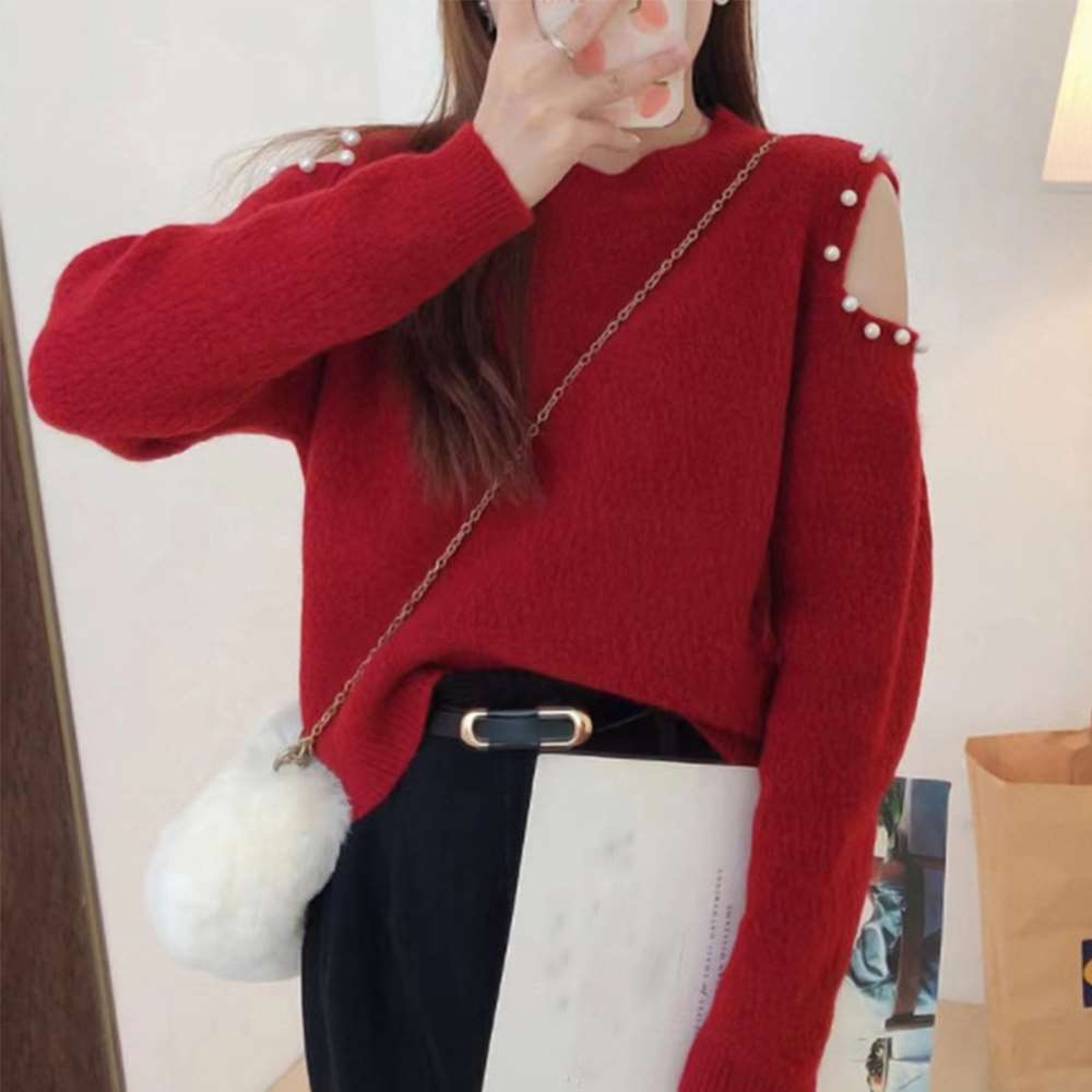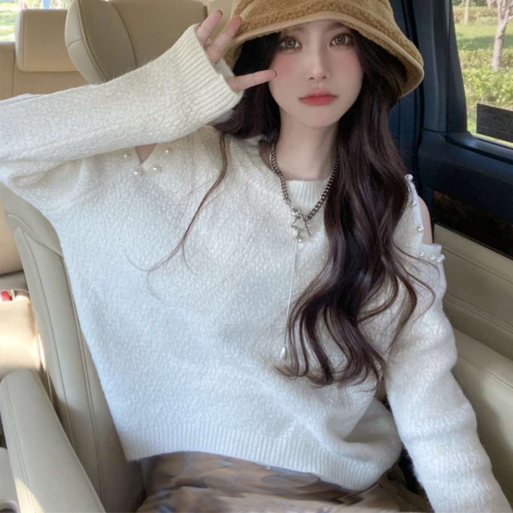 パールをあしらった肩開きデザインである肌見せに大人可愛い長袖ニットトップスです