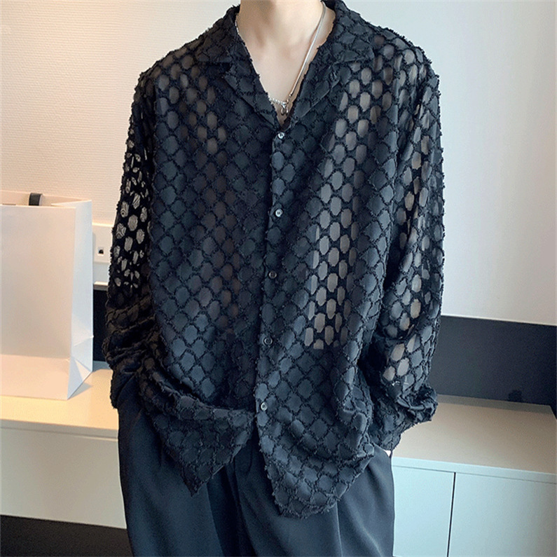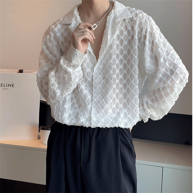 メンズ シャツ カジュアルシャツ 長袖 白黒 透け感 男子トップス ダンスウェア 公演 菱形 発表会 春秋 スタイリッシュ 上着 ブラック ナイトクラブ