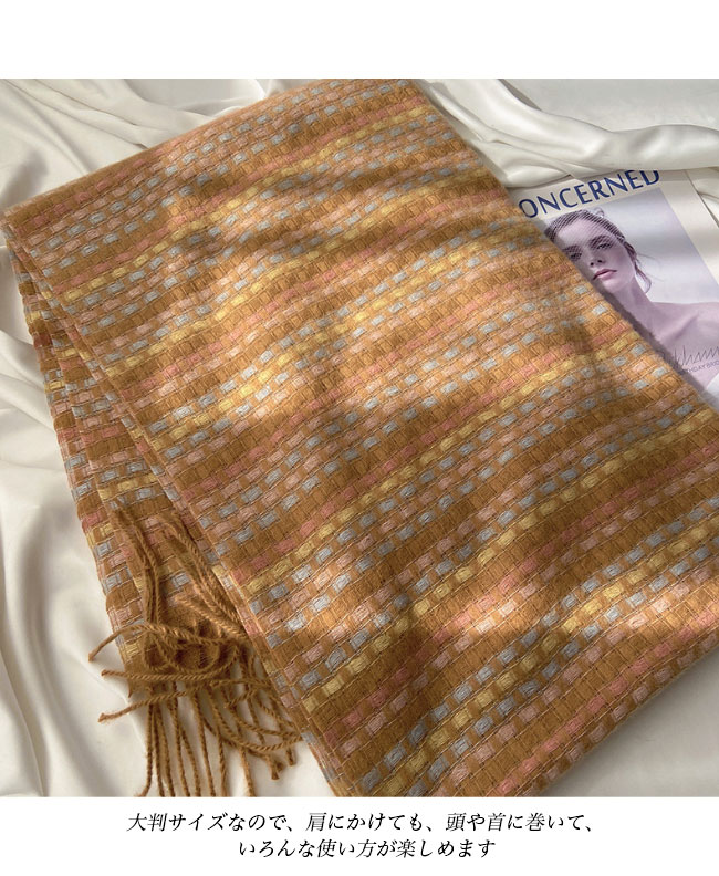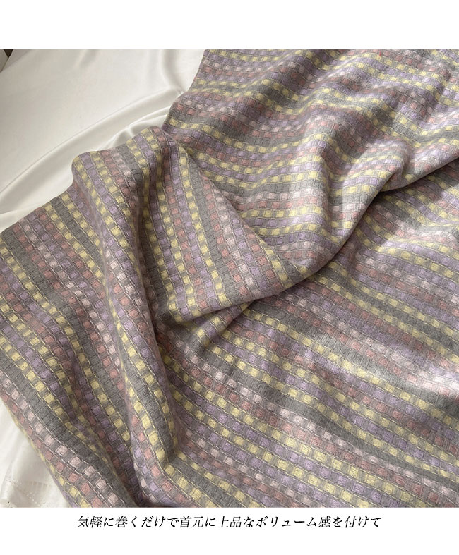 大判サイズなので、肩にかけても、頭や首に巻いて、いろんな使い方が楽しめます