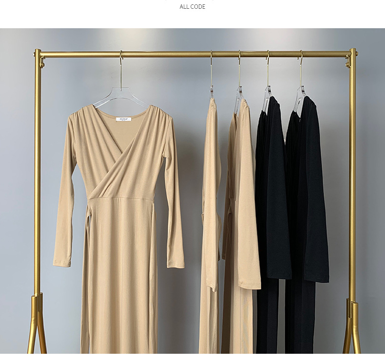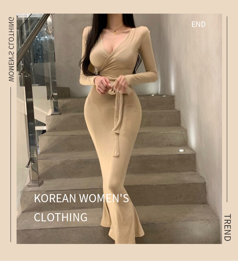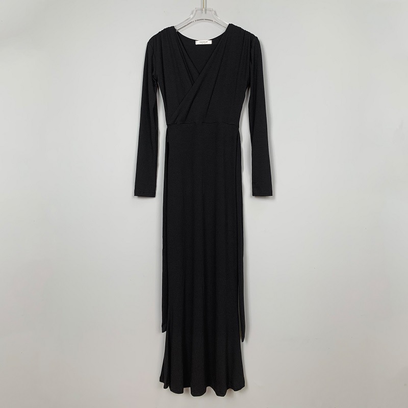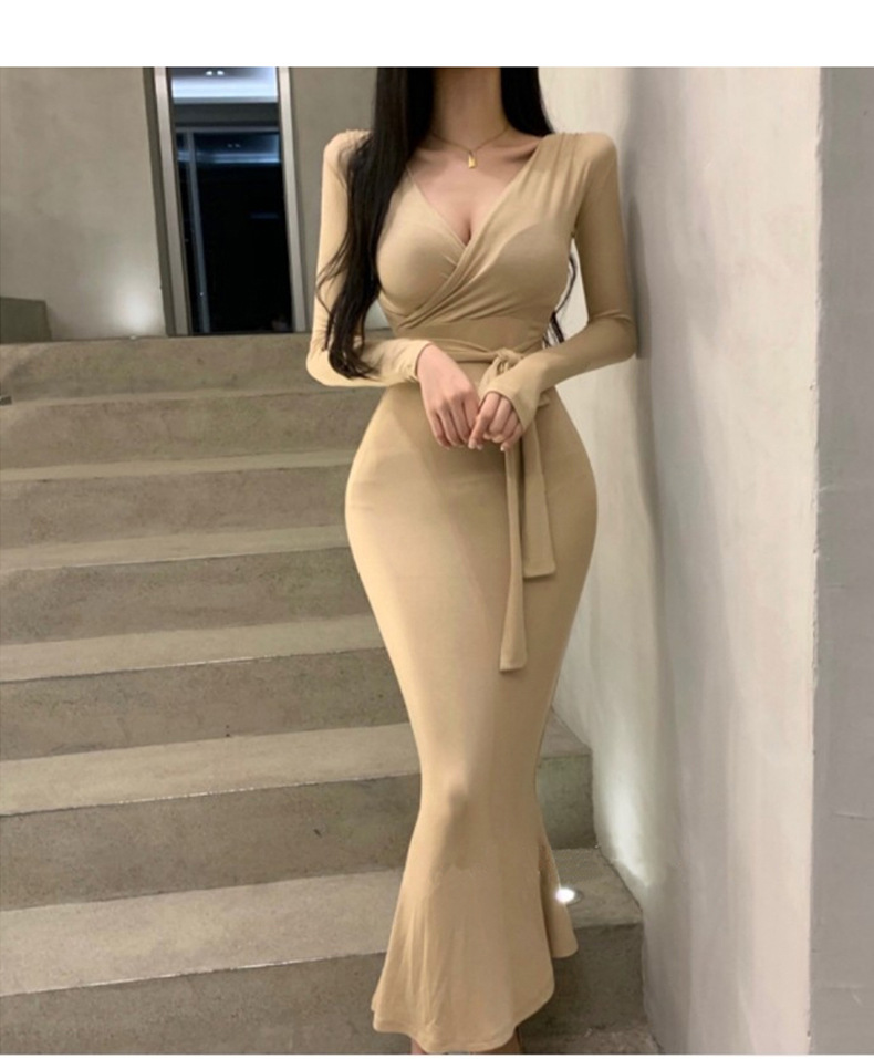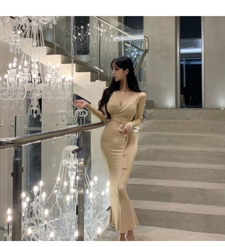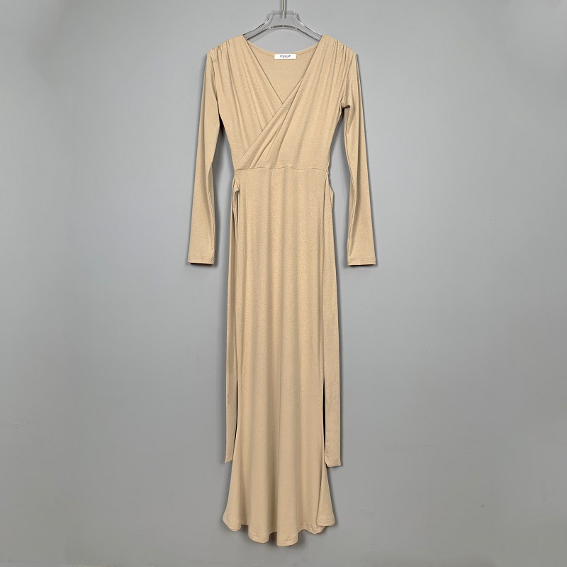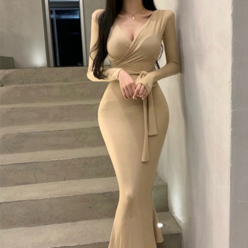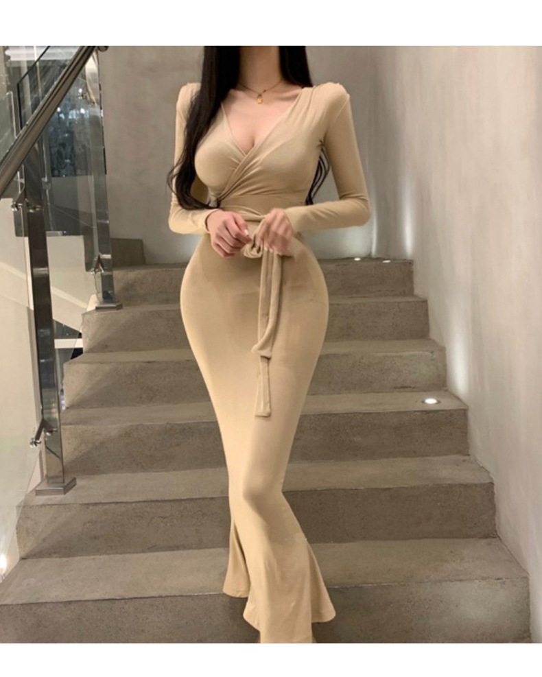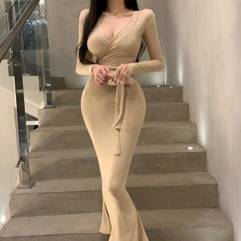 マキシワンピース タイトワンピース レディース 長袖 Vネック ボディコン 裾フひも付き きれいめ カジュアル ロング丈 ワンピ セクシー 女性