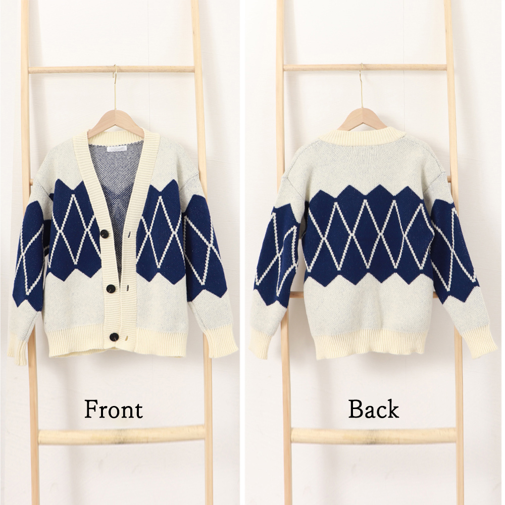 レトロ感のある印象に演出してくれるアーガイル柄ニットカーディガン