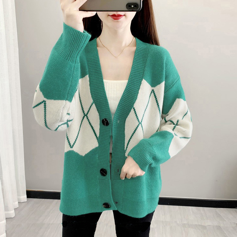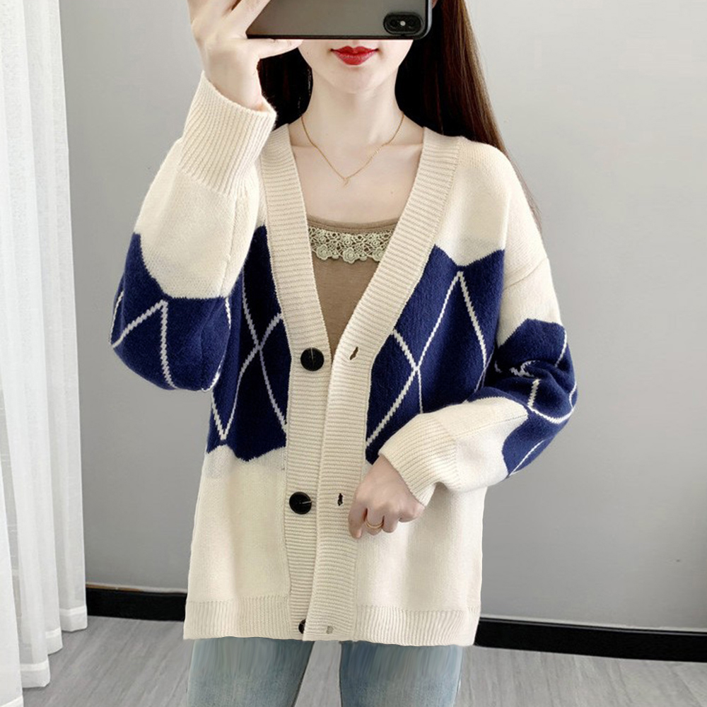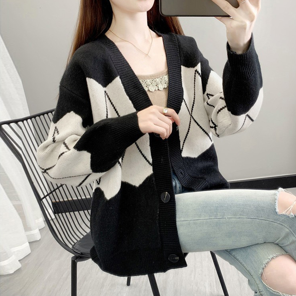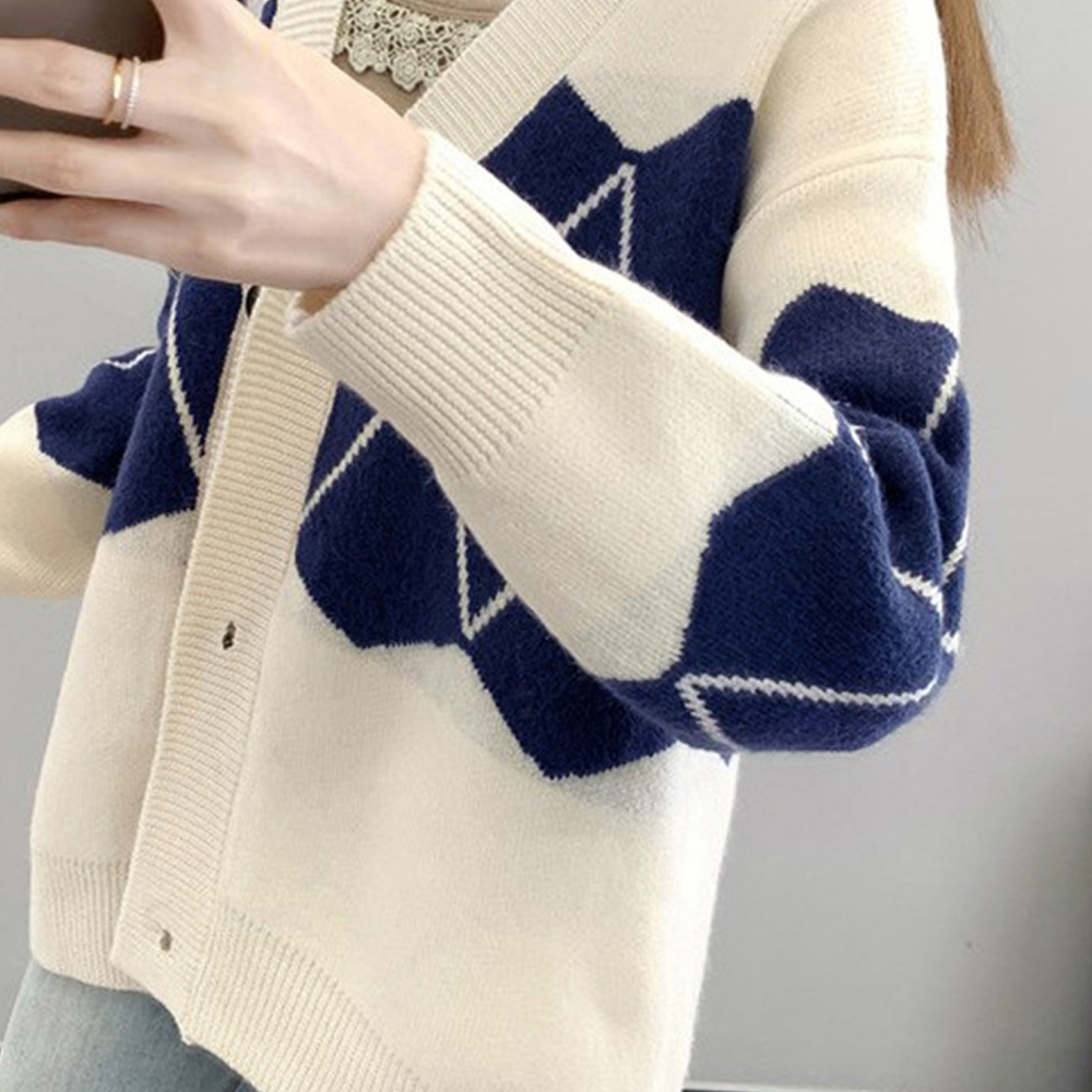 レディース アーガイル柄カーディガン 羽織り ニットアウター 韓国風 Vネック 秋服カジュアル 前開き トップス通勤通学