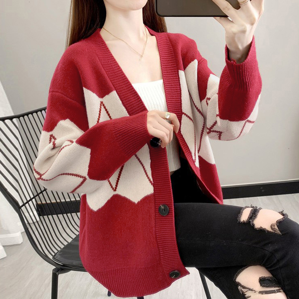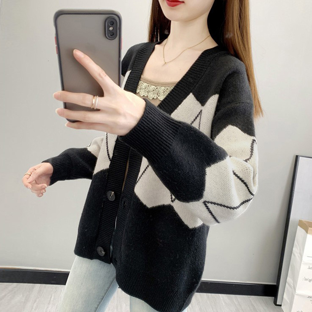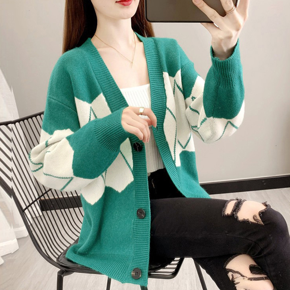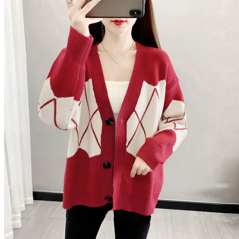 レディース アーガイル柄カーディガン 羽織り ニットアウター 韓国風 Vネック 秋服カジュアル 前開き トップス通勤通学