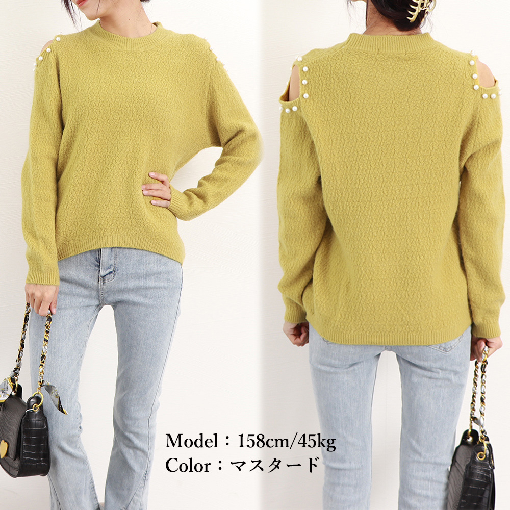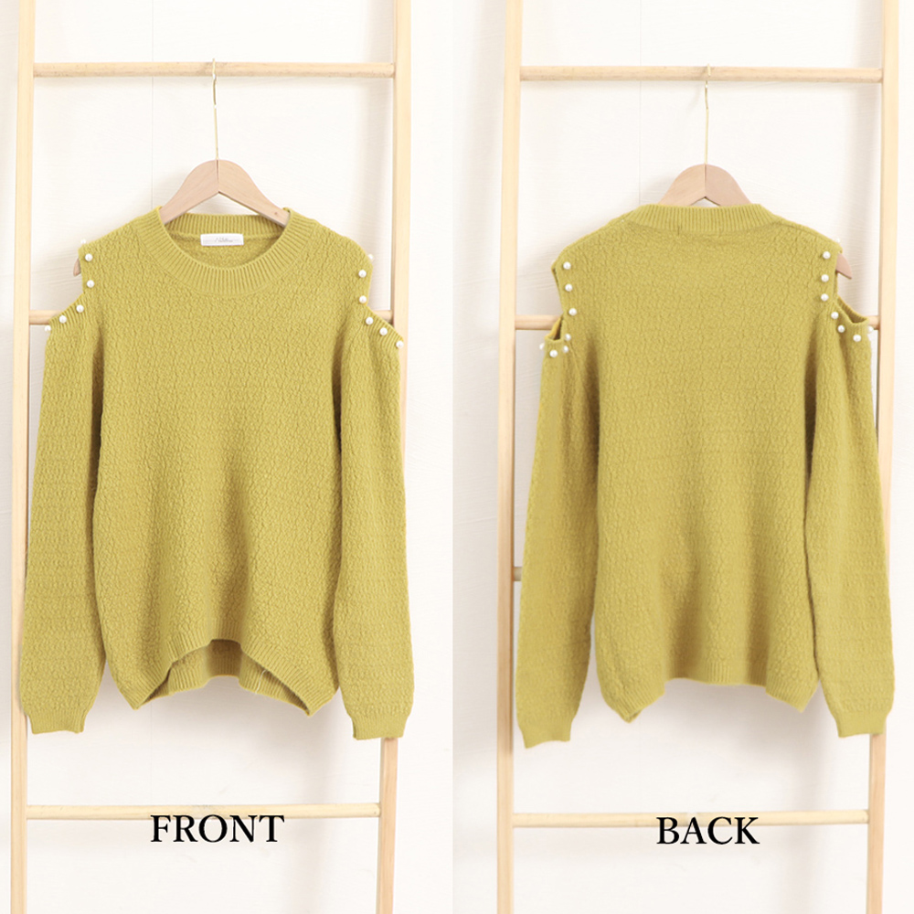 パールをあしらった肩開きデザインである肌見せに大人可愛い長袖ニットトップスです