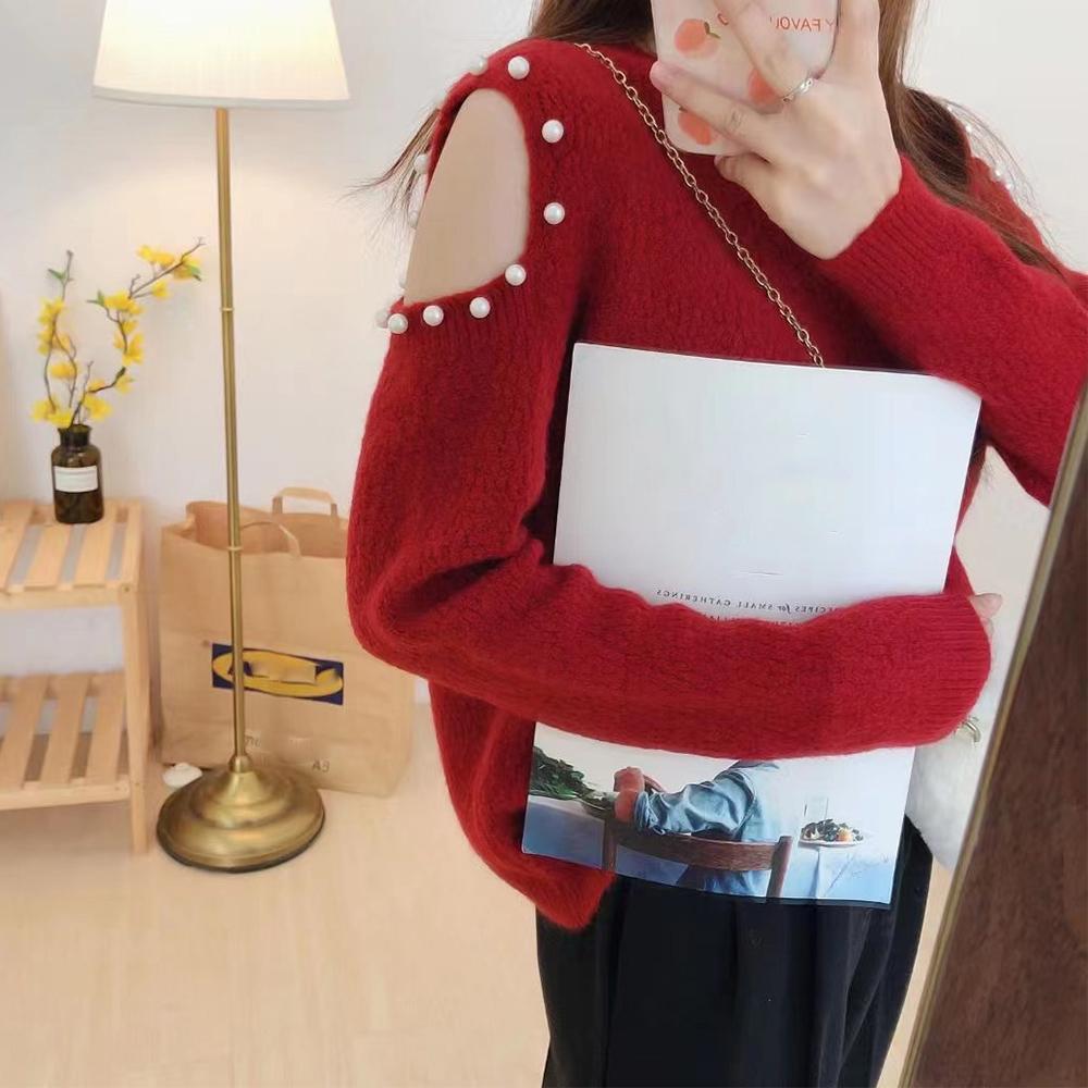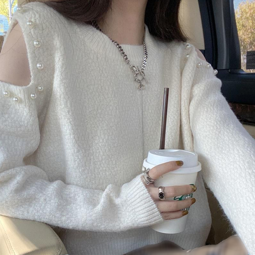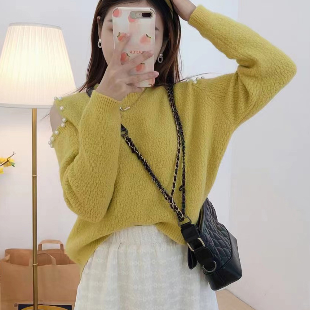 レディース オープンショルダー ニットセーター パール ショートトップス 大人可愛い 韓国カジュアル ニットプルオーバー