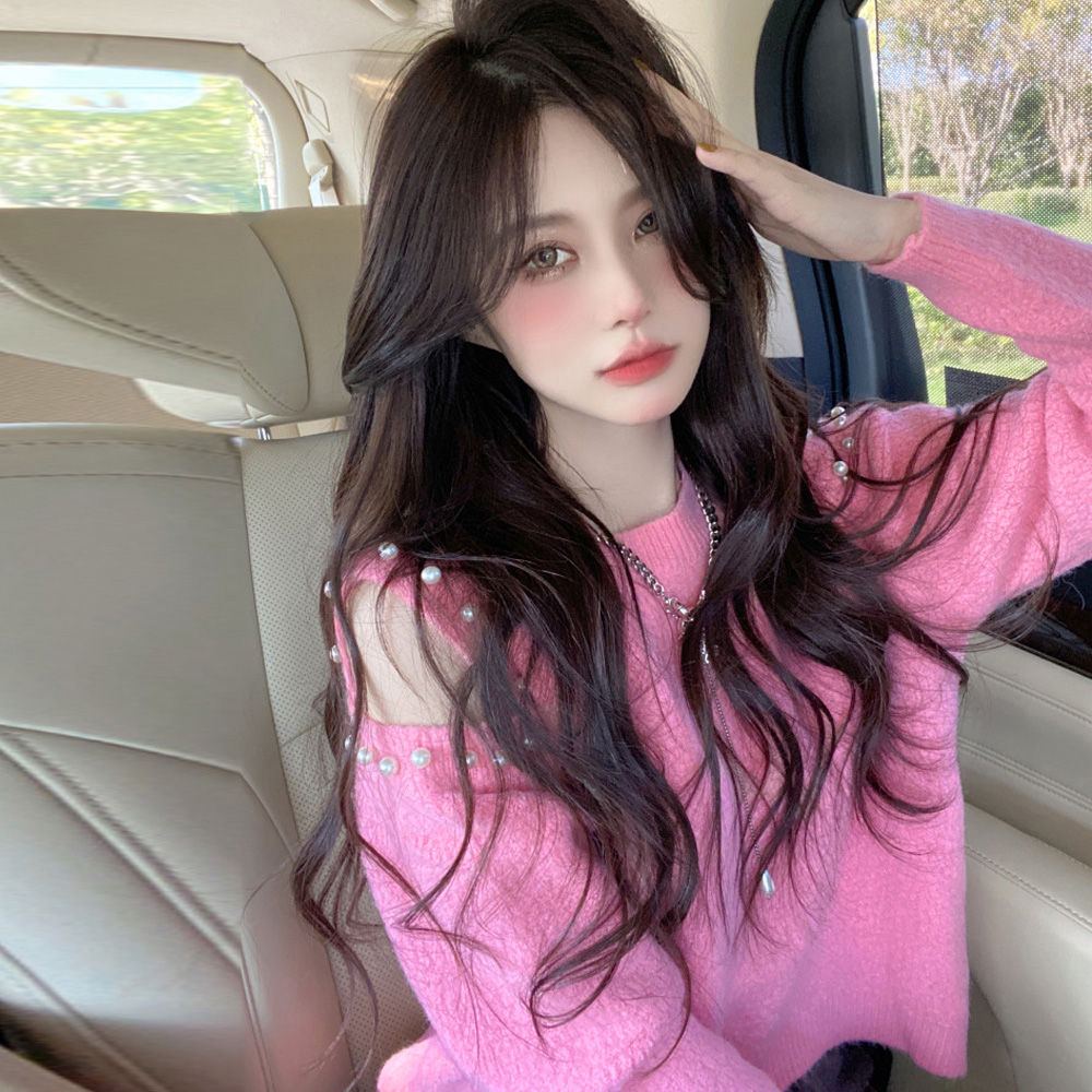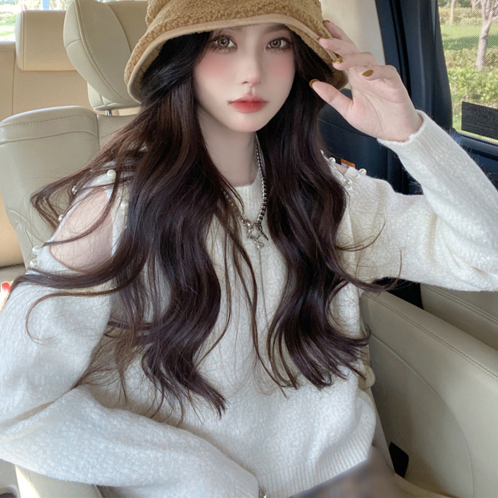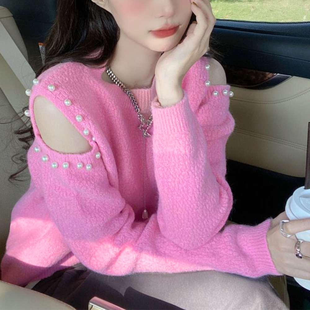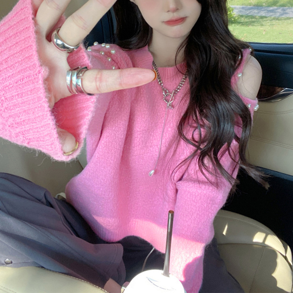 レディース オープンショルダー ニットセーター パール ショートトップス 大人可愛い 韓国カジュアル ニットプルオーバー