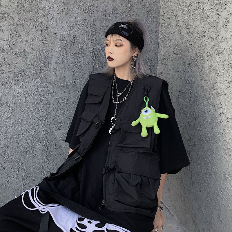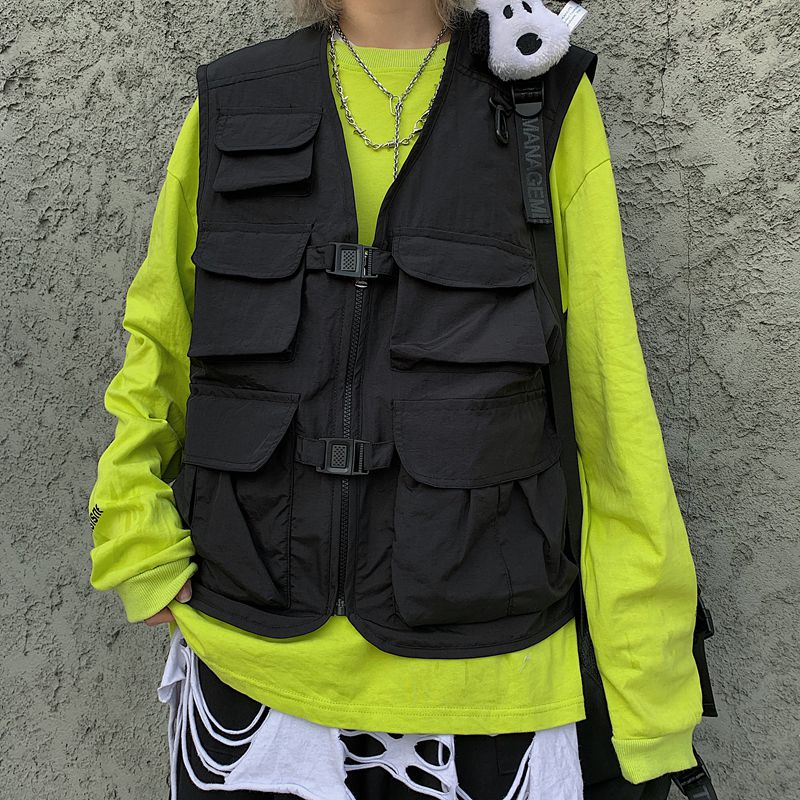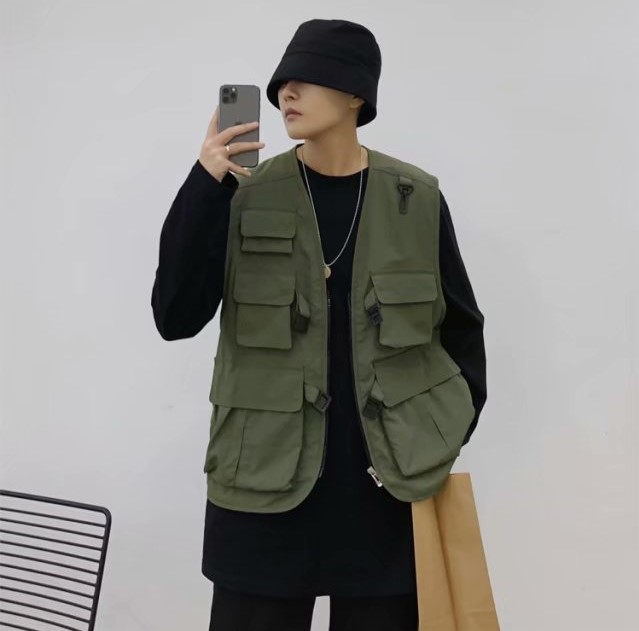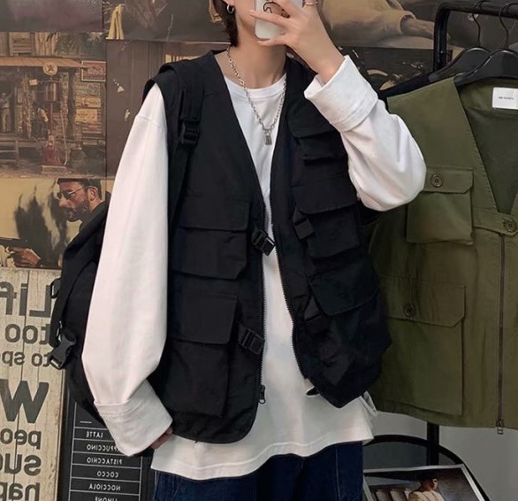 ダンス 衣装 ヒップホップ HIPHOP ユニセックス ベスト 無地 シンプル 黒 ブラック カーキ ジップアップ ジッパー アウター おしゃれ 可愛い かっこいい 奇抜 個性的 個性派 派手 ストリート スケーター KPOP 大人 服 上 大きいサイズ ゆったり 長め