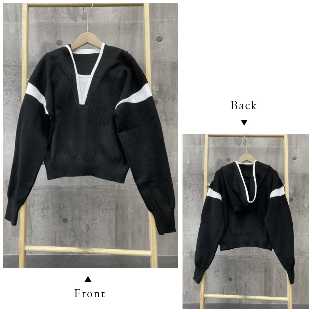 フード付きニットトップス レイヤード風 。可