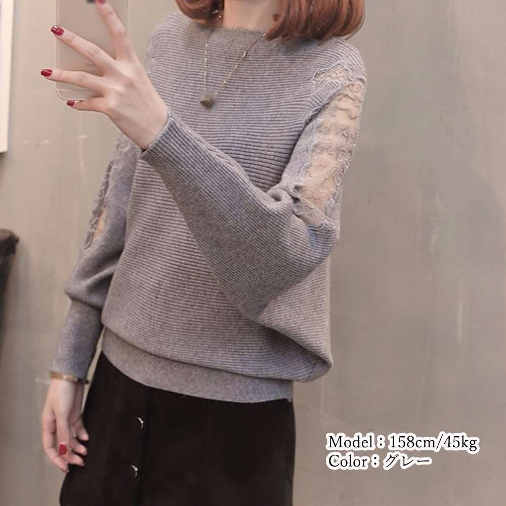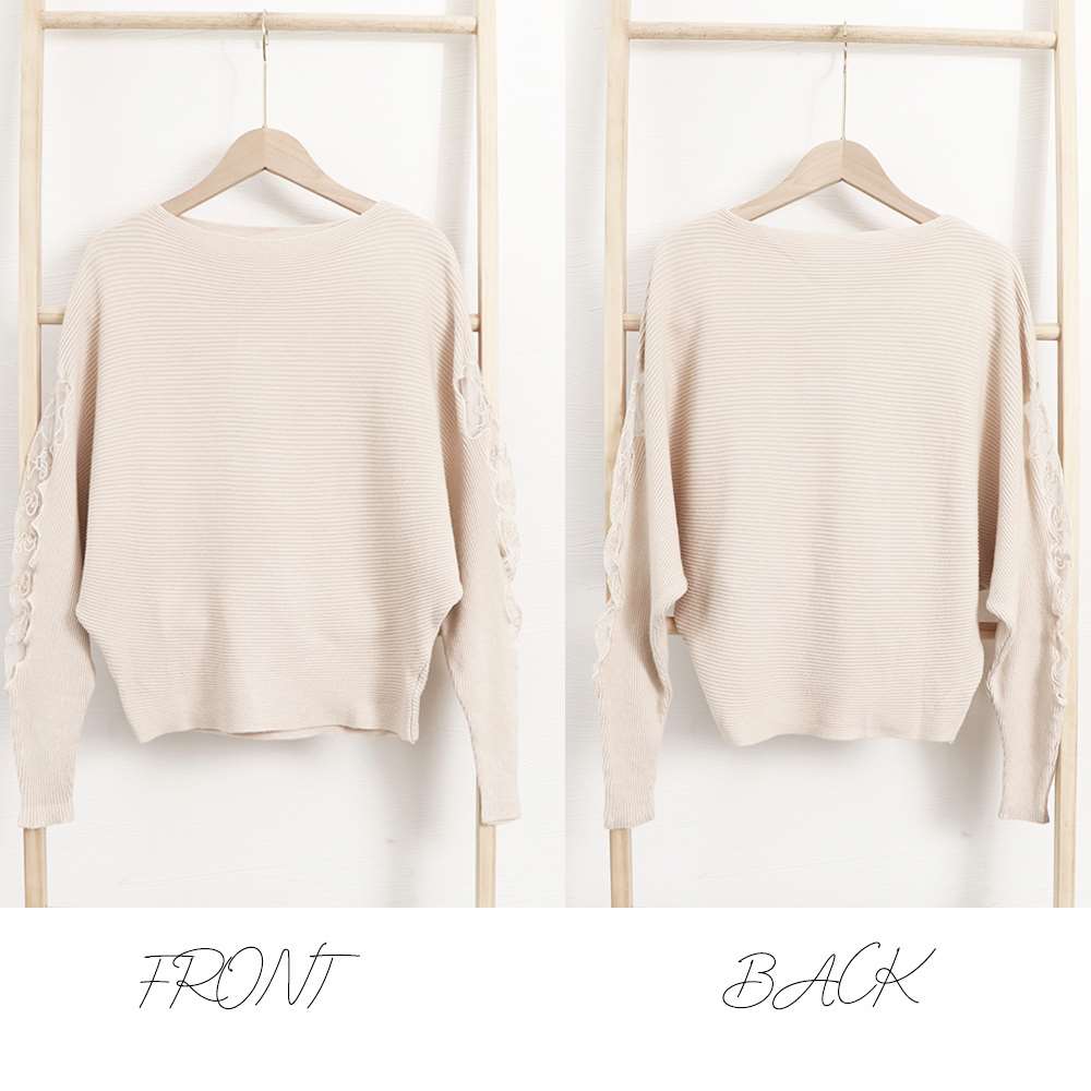 透け感のある刺しゅうレースを肩から袖に施した上品なボートネックニットトップス