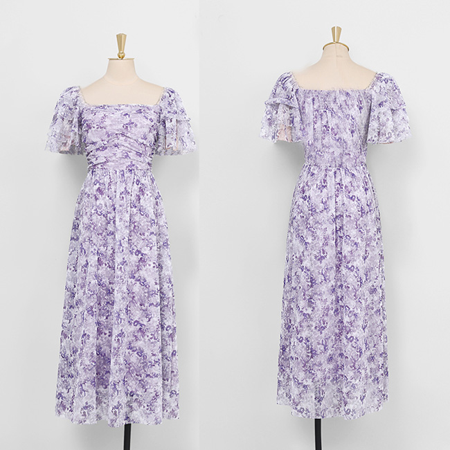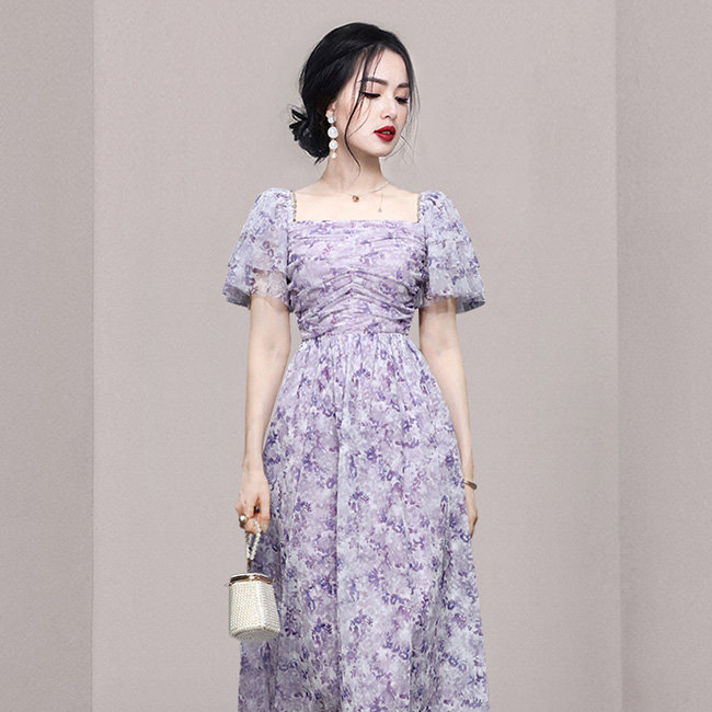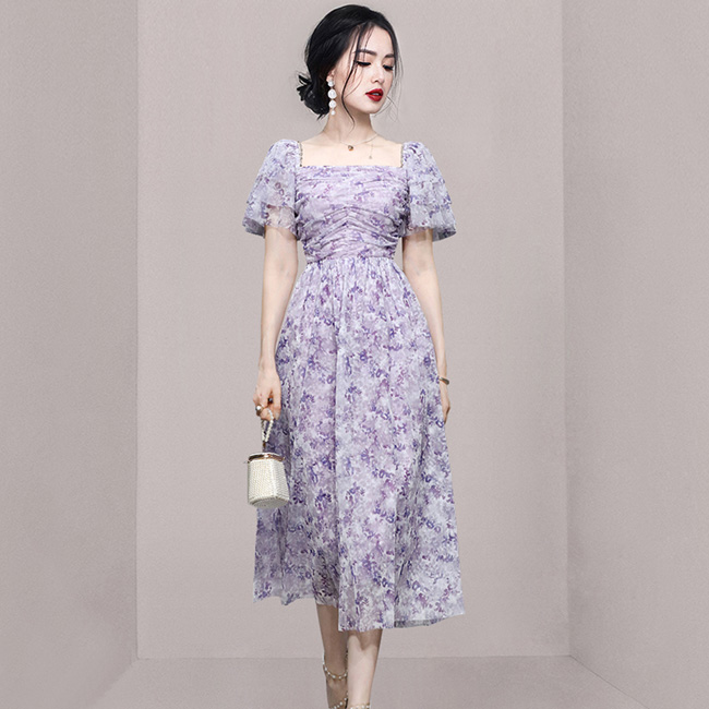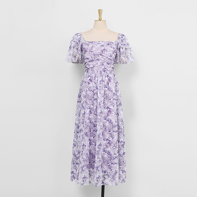 ドレスキャバ。花柄。上品でエレガントなAラインドレスです。デザインピントは胸元のスクウェアカットとバルーン袖です。